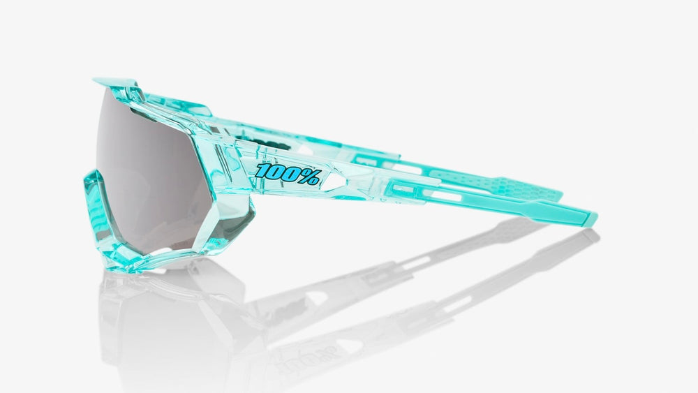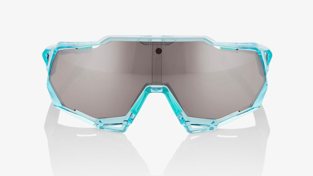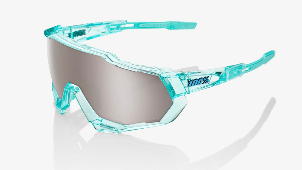 These SPEEDTRAP performance sunglasses feature a bold, shield-style design with a large single-piece lens and an angular, aggressive aesthetic. The frame is crafted from translucent turquoise-blue plastic with a modern, technical look. The wraparound shield lens has a smoky grey mirror finish that provides excellent coverage and protection. The glasses have an aerodynamic profile suited for high-intensity sports and outdoor activities, with secure nose pads and temple arms that ensure they stay in place during movement. The striking geometric shapes and technical design elements give these sunglasses a distinctly contemporary, performance-oriented appearance.