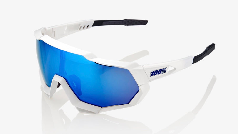 These 100% SPEEDTRAP athletic sunglasses feature a bold, angular shield-style lens design with a distinctive geometric shape. The frame is predominantly matte white with black temple tips for contrast. The oversized blue mirrored lens provides excellent coverage and wraps around for enhanced peripheral vision. The modern, aggressive styling includes ventilation details and ergonomic temple arms designed for secure fit during athletic activities. The glasses exhibit premium construction with integrated nose piece and sleek aerodynamic profile typical of high-performance sports eyewear.