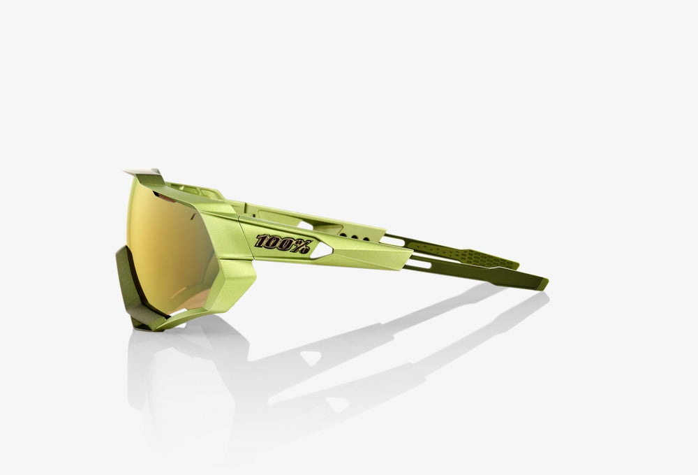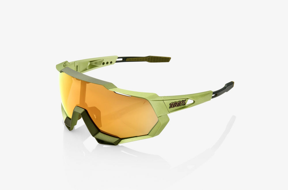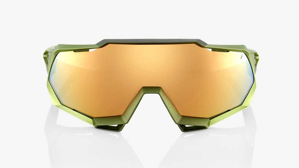 Modern, aggressive-looking sport performance sunglasses with a bold shield-style lens design. The frame features an angular, aerodynamic silhouette in a matte olive green colorway with gold mirrored lens. The wraparound design provides excellent coverage and protection while maintaining a sleek, contemporary aesthetic. The nose piece appears to be integrated with rubber grips for secure fit during athletic activities. The glasses have a premium, high-end sports eyewear look suitable for cycling, running, and other outdoor athletic pursuits.