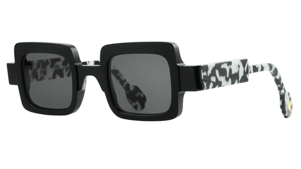 Bold, avant-garde square sunglasses with thick black frames and a striking contrast design. The front frame features a chunky, geometric silhouette while the temple arms showcase an eye-catching black and white camouflage pattern. The design has a strong architectural presence with sharp angles and clean lines, embodying a contemporary, fashion-forward aesthetic. The substantial build and dramatic styling make these sunglasses a statement accessory that combines urban edge with artistic flair.