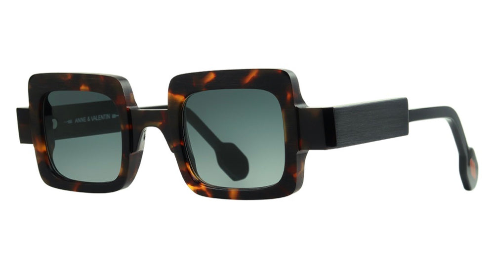 These bold, architectural sunglasses feature a distinctive thick square frame with a tortoiseshell pattern. The frame has a statement-making geometric silhouette with sharp angles and substantial depth. The temples are matte black with a minimalist design that contrasts nicely with the chunky front. Green gradient lenses add a sophisticated touch while providing excellent sun protection. The design reflects a high-fashion, avant-garde aesthetic typical of Anne et Valentins artistic eyewear approach.