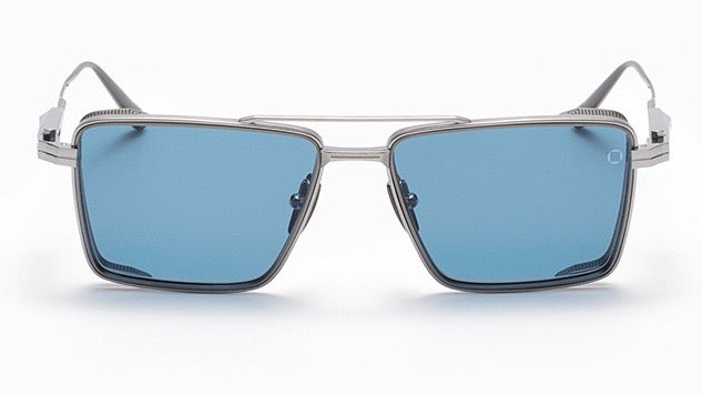 Modern rectangular sunglasses with a sleek architectural design featuring a minimalist silver metal frame and striking light blue lenses. The glasses showcase clean geometric lines with a contemporary angular silhouette. The nose bridge and temple arms maintain the same refined metallic aesthetic, creating a cohesive high-end look. The design appears to be inspired by modern industrial architecture with its precise angles and sophisticated engineering.