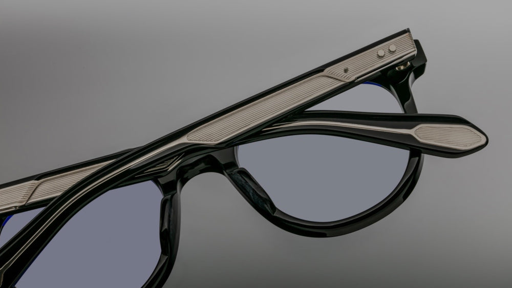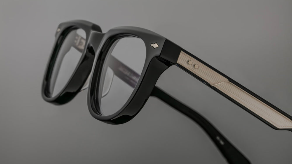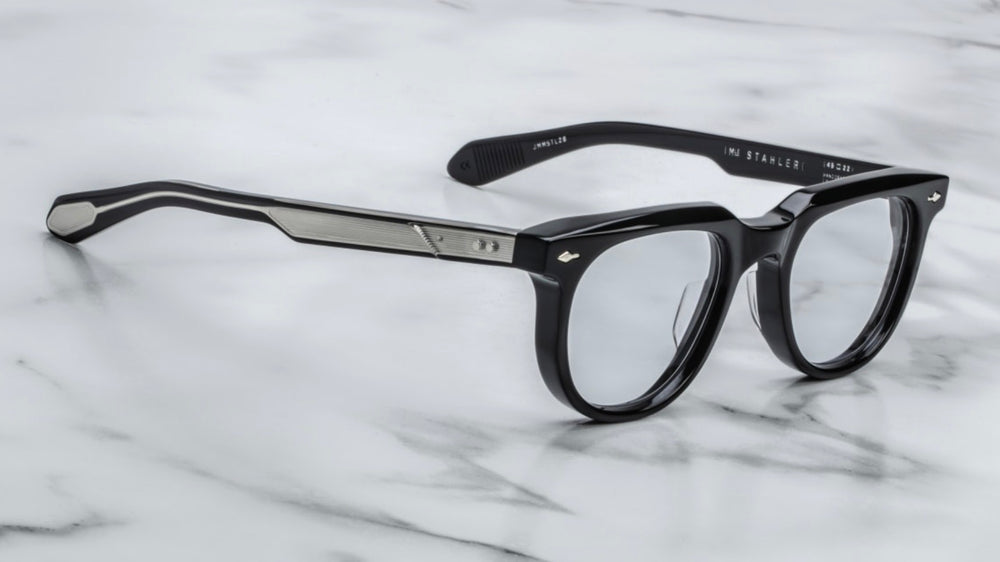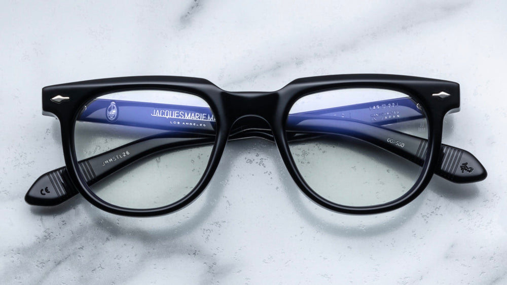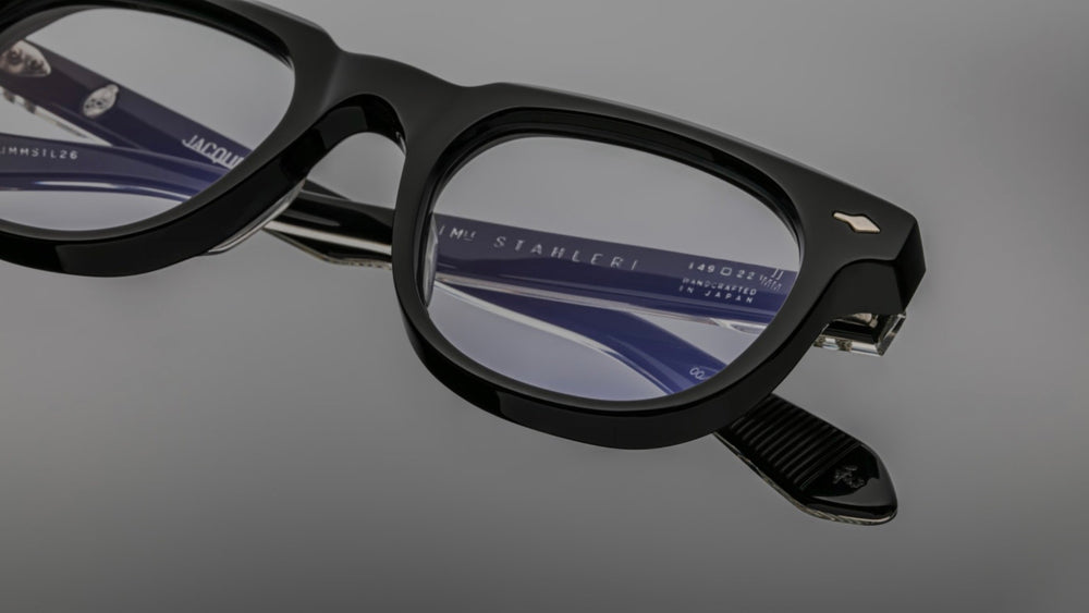 The JACQUES MARIE MAGE Stahler features a bold, chunky square silhouette with a glossy black acetate frame. The substantial frame makes a strong statement while maintaining classic proportions. The temples show the brand name in blue lettering, adding a subtle contrast detail. The glasses have a distinctly vintage-inspired design with modern refinements, characteristic of high-end eyewear craftsmanship. The frame demonstrates excellent build quality with clean lines and precise construction.