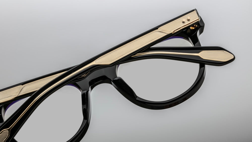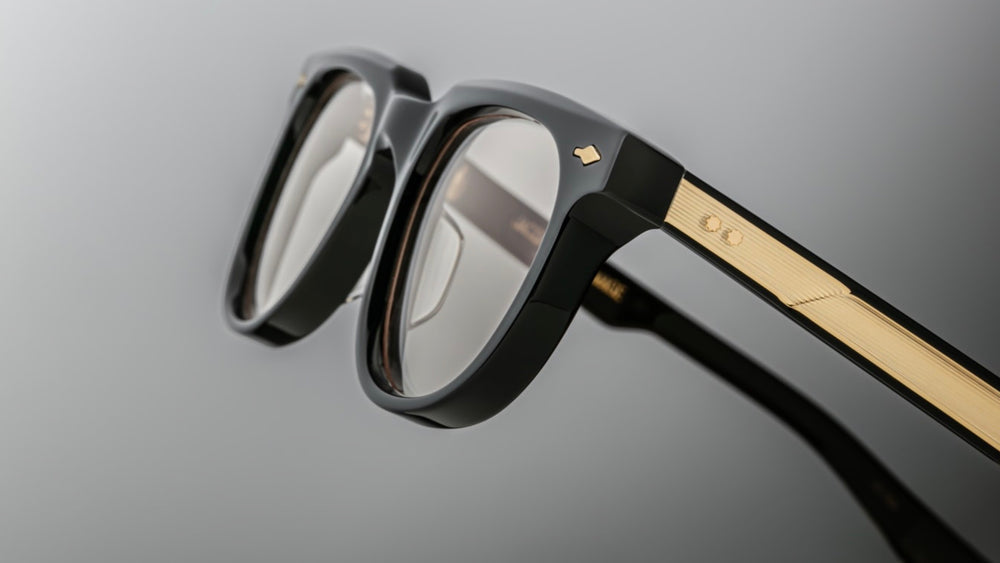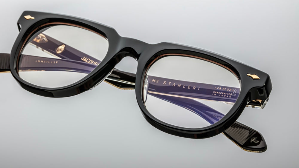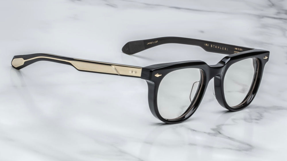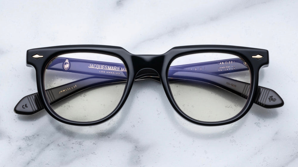 Classic square-shaped Jacques Marie Mage frames featuring a glossy black acetate construction with signature diamond rivets on the front corners. The frames have a sophisticated retro-inspired design with substantial temple arms and clean lines throughout. The glasses showcase premium craftsmanship with smooth finishing and subtle branding on the inner temple. The timeless wayfarer-influenced silhouette offers a refined, intellectual aesthetic suitable for both casual and formal wear.
