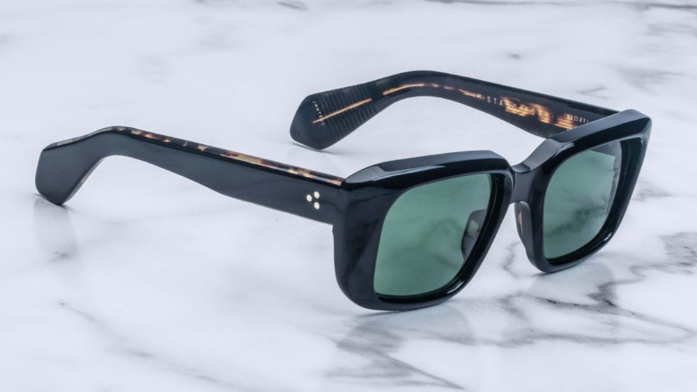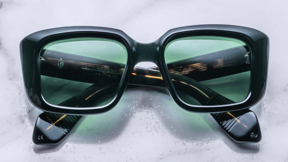 Bold and luxurious Jacques Marie Mage square frames featuring chunky acetate construction with a dark glossy finish. The oversized silhouette has pronounced angles and thick temple arms characteristic of the brands signature vintage-inspired aesthetic. The green-tinted lenses are set within substantial rims, creating a sophisticated statement piece with retro undertones. The design exhibits exceptional quality craftsmanship with clean lines and balanced proportions.