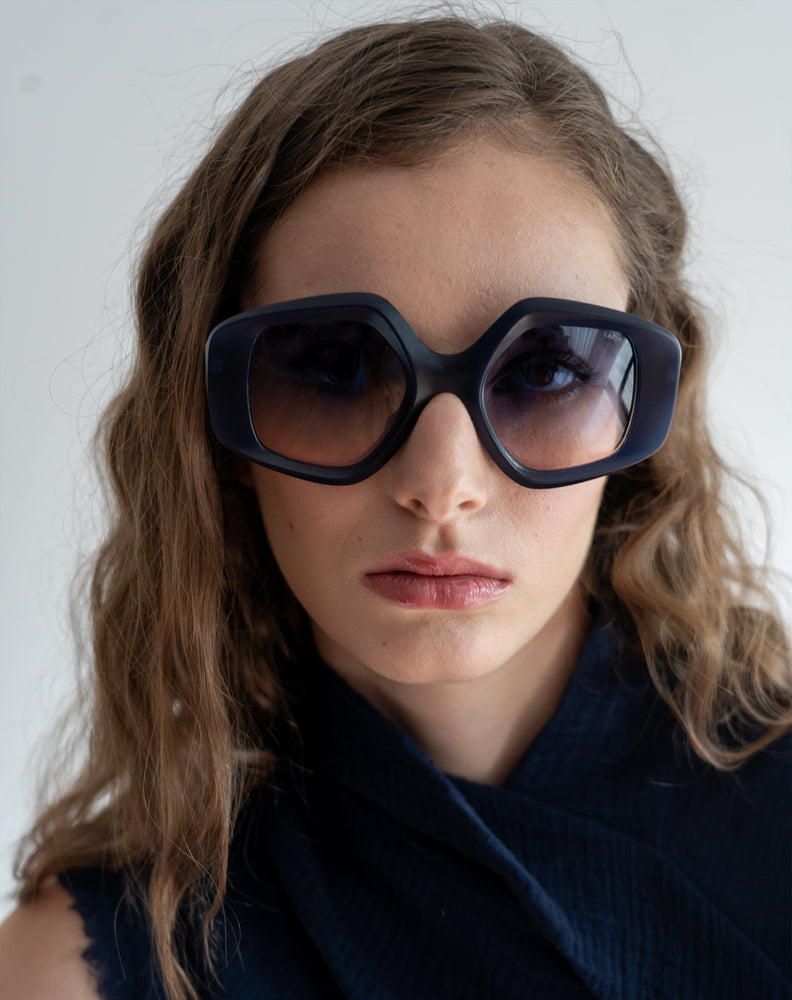 Large oversized geometric sunglasses with a bold, avant-garde silhouette featuring thick black frames. The lenses have a subtle gradient effect transitioning from blue to pink tones. The distinctive angular shape and substantial frame construction create a dramatic, high-fashion statement piece. The design showcases clean lines with a modern architectural aesthetic, characteristic of LAPIMAs luxurious eyewear approach.