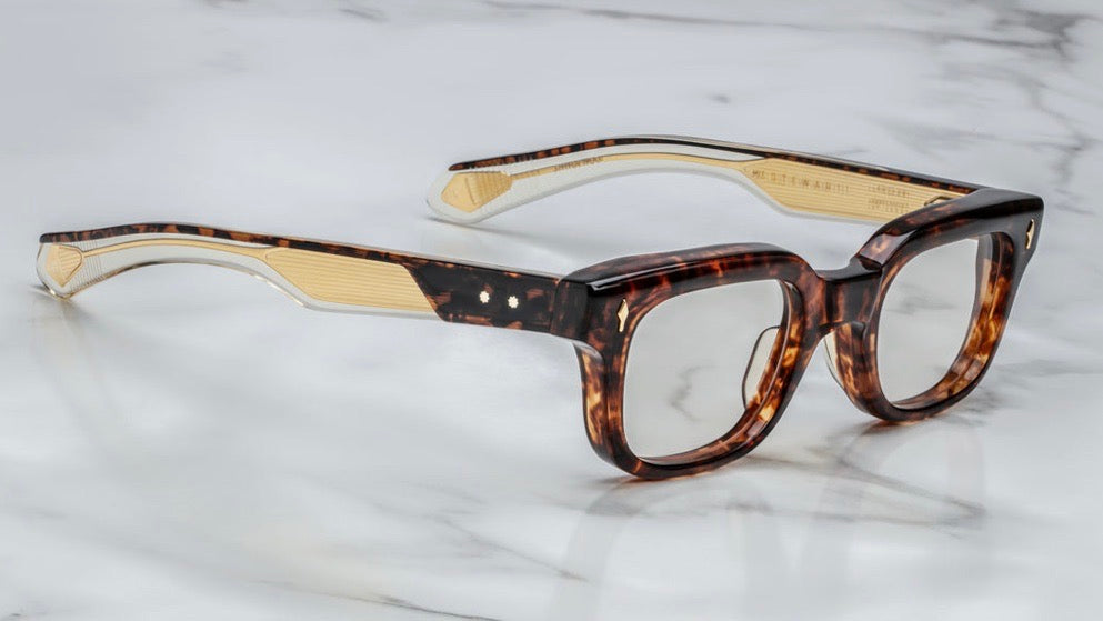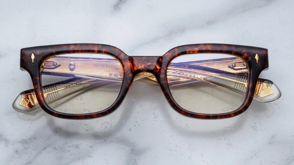 A sophisticated pair of chunky rectangular frames in a rich tortoiseshell pattern. The frame features distinctive gold diamond-shaped rivets on the front corners. The acetate material has a beautiful depth and marbling effect in warm amber and dark brown tones. The glasses have a vintage-inspired design with substantial temple arms that complement the bold front profile. The saddle bridge provides a classic fit while maintaining the frames sophisticated aesthetic.