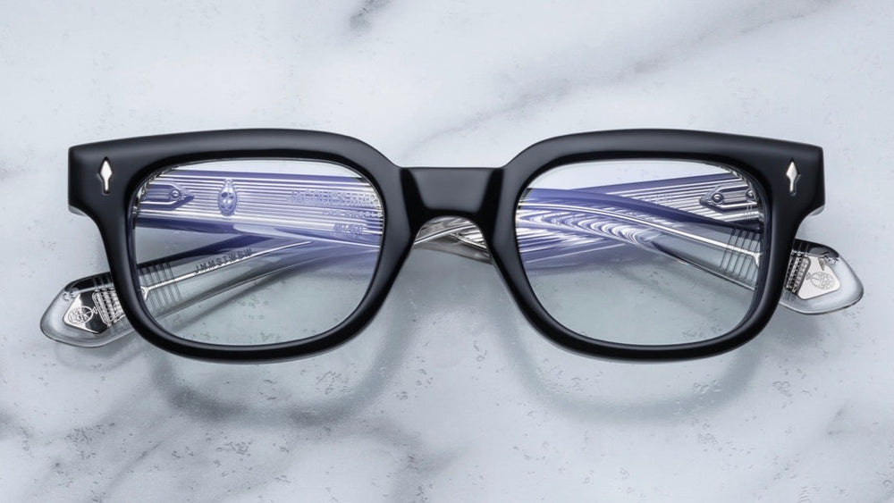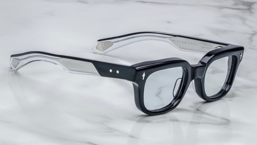 A sophisticated pair of chunky black acetate frames with a bold architectural presence. The frames feature a classic square silhouette with substantial thick rims and temple arms, giving them a distinguished vintage-inspired look. Small diamond-shaped silver accents on the front corners add a subtle decorative touch. The glasses have a commanding presence while maintaining clean lines and professional aesthetics suitable for any formal or casual setting.