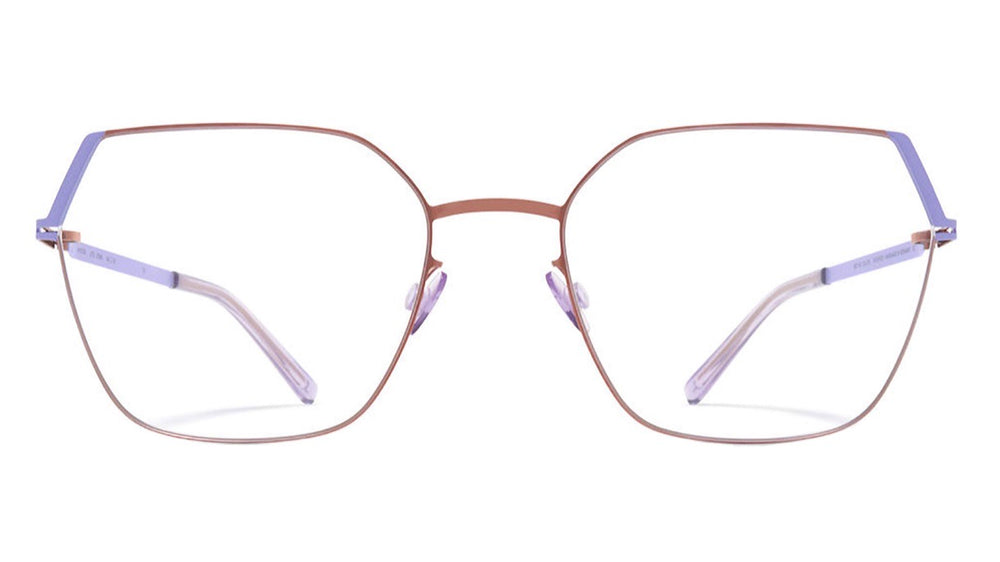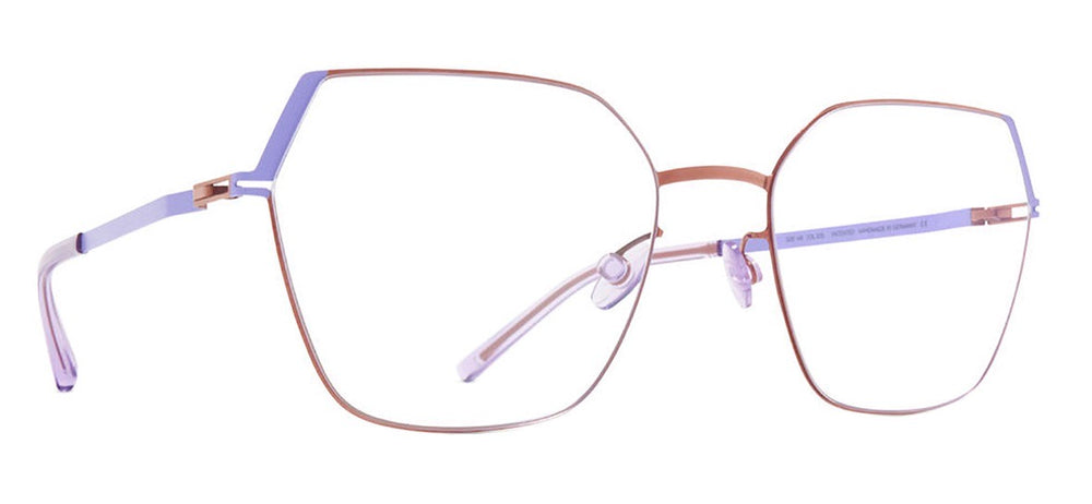 Modern geometric eyeglasses featuring an angular hexagonal silhouette with a refined metallic bronze frame and contrasting lavender temple arms. The design showcases clean lines with a minimalist aesthetic, featuring delicate nose pads and slim temple arms that create a sophisticated, contemporary look suitable for both casual and professional settings. The architectural form balances sharp angles with subtle curves for a striking yet wearable statement piece.