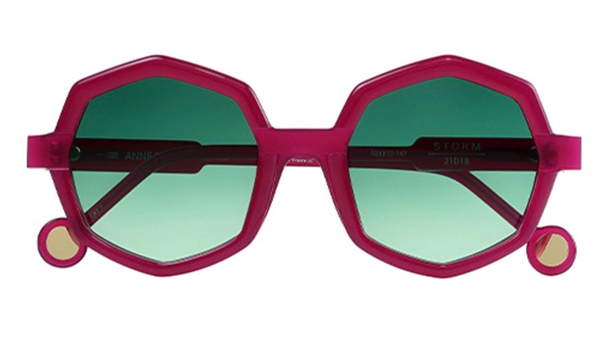 These striking geometric sunglasses feature a bold octagonal shape in a vibrant fuchsia pink colorway. The frames are made of high-quality plastic with a substantial, statement-making thickness. The lenses are a gradient green tint that adds sophistication to the playful design. Notable design elements include small circular gold accents on the temples and a seamlessly integrated bridge. The overall aesthetic is both avant-garde and feminine, perfect for making a fashion statement while providing sun protection. The chunky construction and unique angular shape create an architectural, high-fashion look thats distinctly modern.