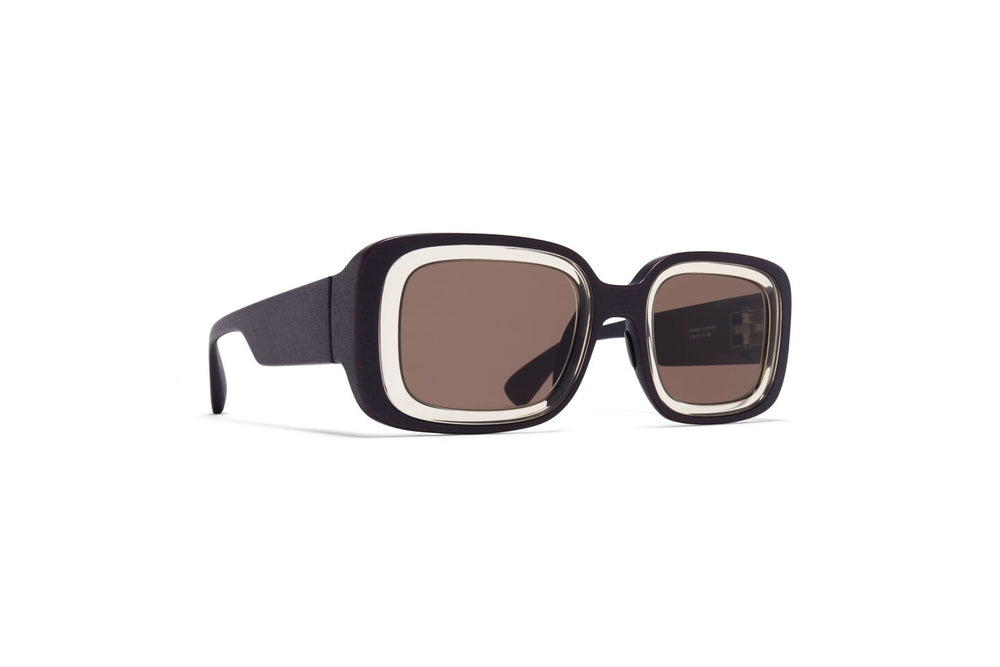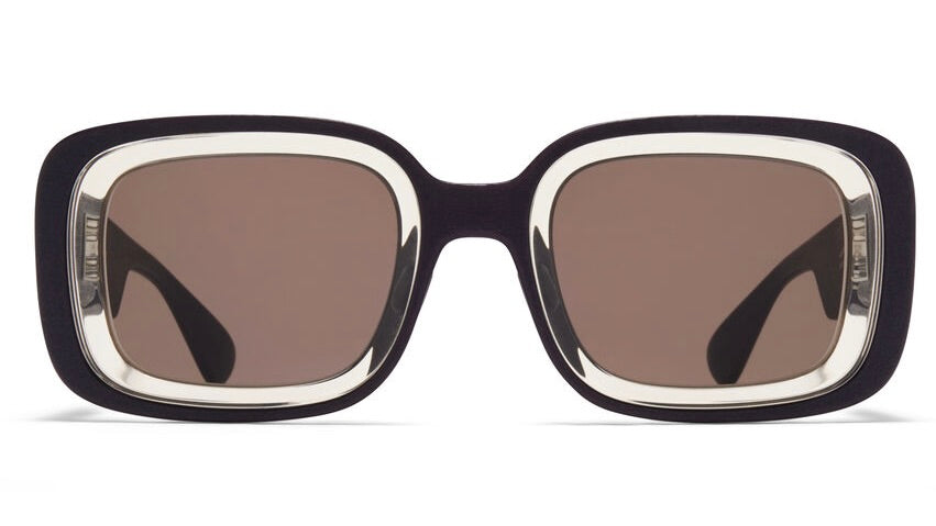 These striking oversized square sunglasses feature a bold black frame with a distinctive clear/white acetate inner layer creating a layered effect. The design is distinctly modern and architectural with substantial frame thickness and clean geometric lines. The brown-tinted lenses are set within a contemporary squared-off silhouette. The temples maintain the same bold black coloring and thickness as the front frame, creating a cohesive look. The sunglasses have a sophisticated yet edgy aesthetic that would appeal to those seeking a fashion-forward, statement-making accessory.