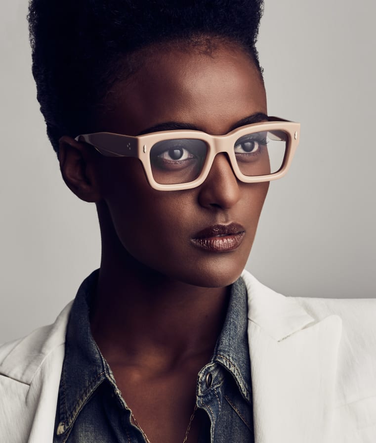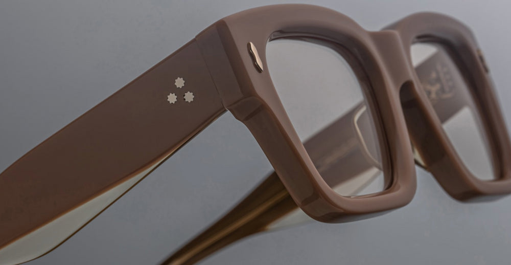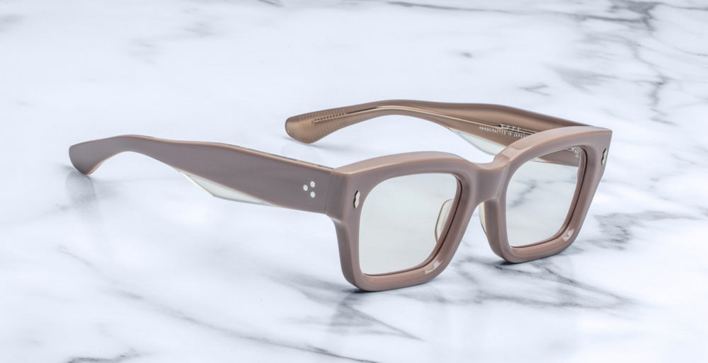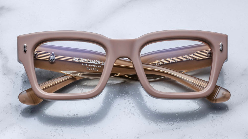A limited edition sophisticated square-frame optical glasses in a matte dusty rose/nude pink color. The frames feature a bold, architectural silhouette with substantial thickness and clean geometric lines. The design appears to be from Jacques Marie Mages Los Angeles collection (marked 00/300 suggesting a limited run). The frames have a modernist aesthetic with subtle detailing on the temple arms. The chunky acetate construction gives these glasses a luxurious, statement-making presence while maintaining a neutral, versatile colorway.