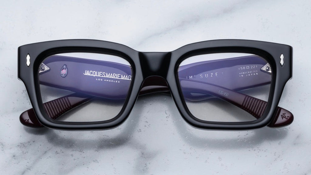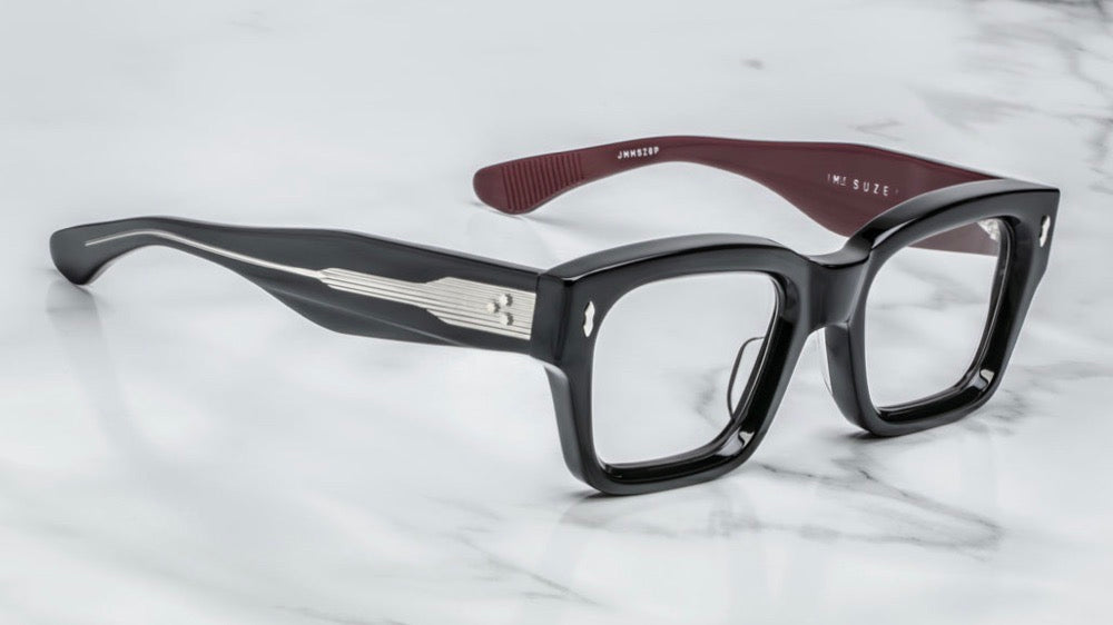 A bold, oversized square-framed optical design from Jacques Marie Mages Los Angeles collection. The frames feature a chunky, architectural silhouette with thick glossy black acetate construction. The pronounced brow line and substantial temple arms create a striking geometric presence. Small diamond-shaped silver accents appear at the front corners. The frames are handcrafted in Japan with premium materials and showcase the brands signature blend of vintage inspiration and contemporary luxury styling. The temple tips have subtle ribbed detailing.