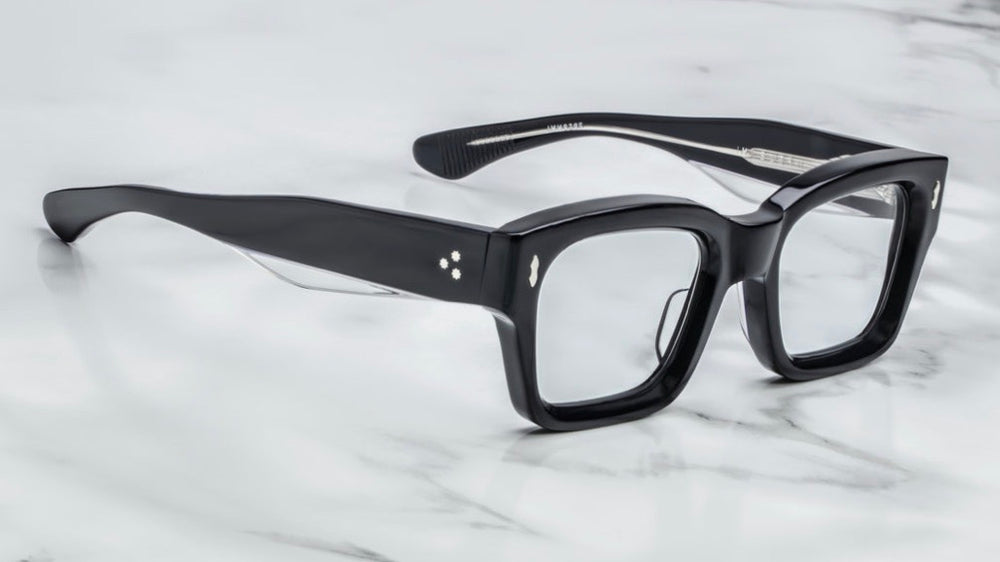 These Jacques Marie Mage glasses feature a bold, chunky square frame design with a glossy black finish. The frames have a distinctive architectural quality with sharp angles and a substantial presence. The eyewear showcases clean lines and a vintage-inspired silhouette with modern refinement. The thick acetate construction gives them a premium, luxury feel. Small silver decorative rivets accent the front corners, adding a subtle metallic detail to the otherwise all-black design. The lenses are clear and the overall aesthetic is sophisticated and intellectual while maintaining an edge of avant-garde style.