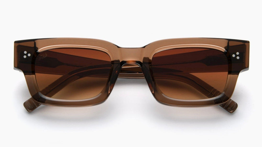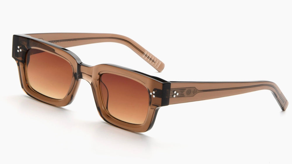 These are chunky rectangular sunglasses with a bold retro aesthetic. The frames feature a translucent brown acetate construction with a gradient effect, darker at the top and lighter towards the bottom. The lenses are brown-tinted and rectangular. The design includes subtle dot detailing on the temple hinges. The overall style is modern yet vintage-inspired, with substantial frames that make a strong fashion statement. The sunglasses have a contemporary streetwear appeal while maintaining classic proportions.