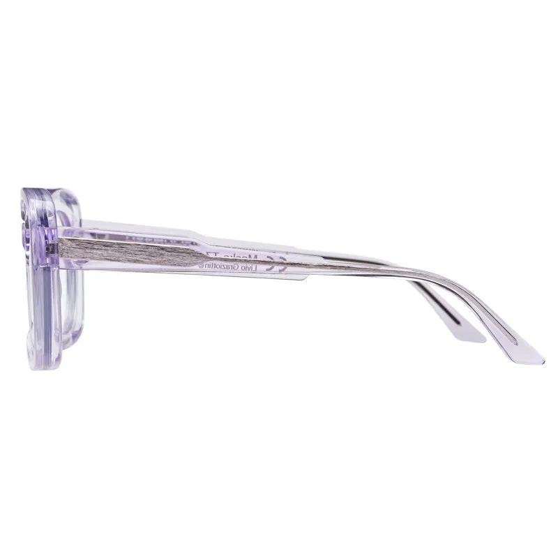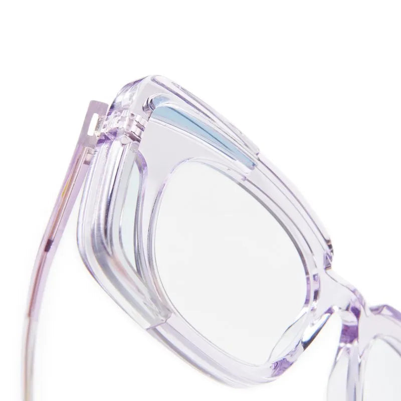 These bold oversized square frames feature a unique transparent grey acetate construction with a distinctive double-layered design. The chunky silhouette is complemented by thick temple arms with purple accents. The frames have a modernist, avant-garde aesthetic with clean geometric lines and a substantial presence. The saddle bridge is integrated seamlessly into the frames architectural design. The transparent material allows light to play through the frames, creating subtle depth and dimension.