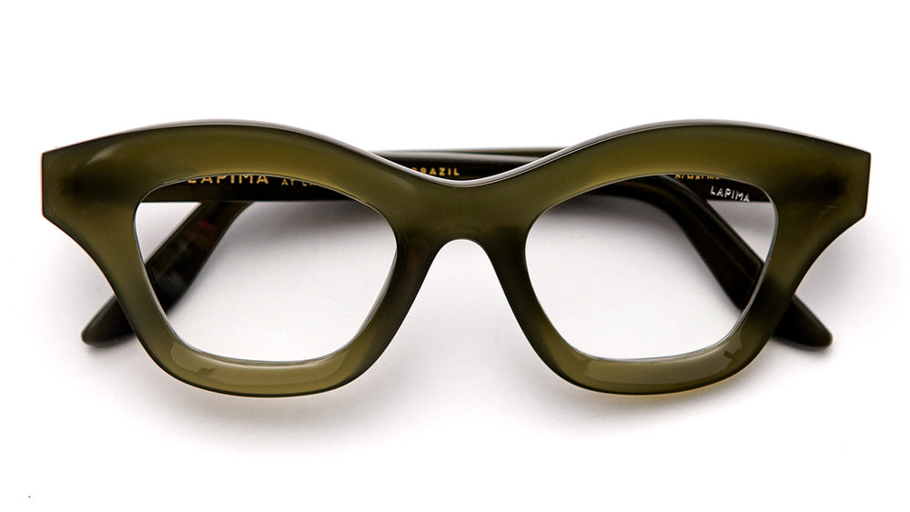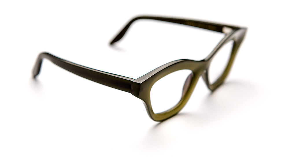 Striking thick-framed cateye glasses in an olive green translucent acetate. Features bold geometric angles and a distinctive retro-modern silhouette. The frames have a substantial presence with chunky temples and pronounced brow line, creating a sophisticated, statement-making look. The design showcases beautiful depth and dimension in the translucent material, with a slight gradient effect in the coloring.