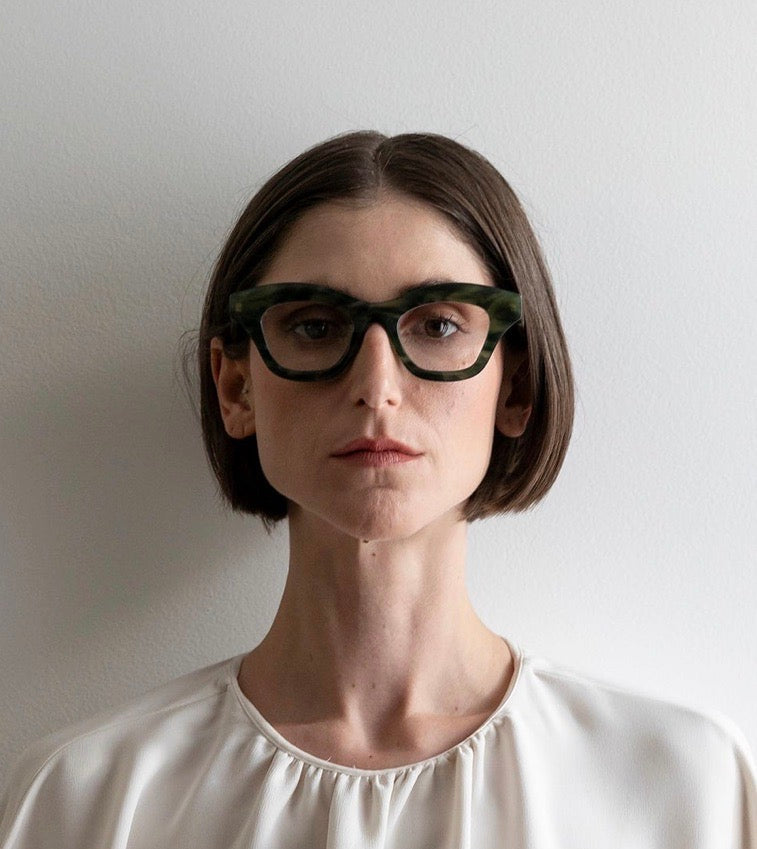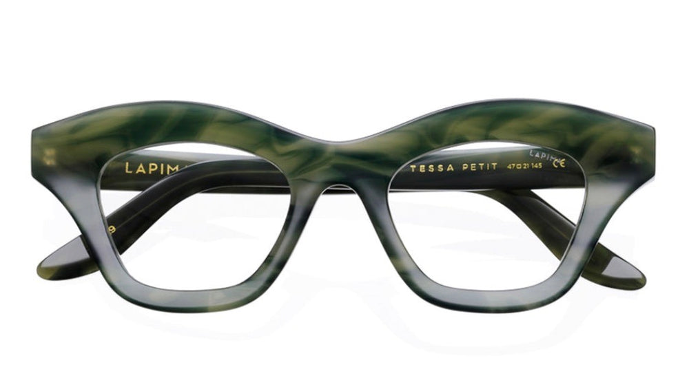 These bold geometric-shaped frames from LAPIMA feature a striking angular silhouette with thick, chunky construction. The frames appear in a marbled dark green acetate with subtle variations in the coloring creating depth and visual interest. The design has a contemporary, artistic feel with its architectural lines and substantial presence. The wide temples maintain the bold aesthetic, while the saddle bridge provides comfortable fit. The oversized proportions and statement design make these glasses a standout accessory piece.
