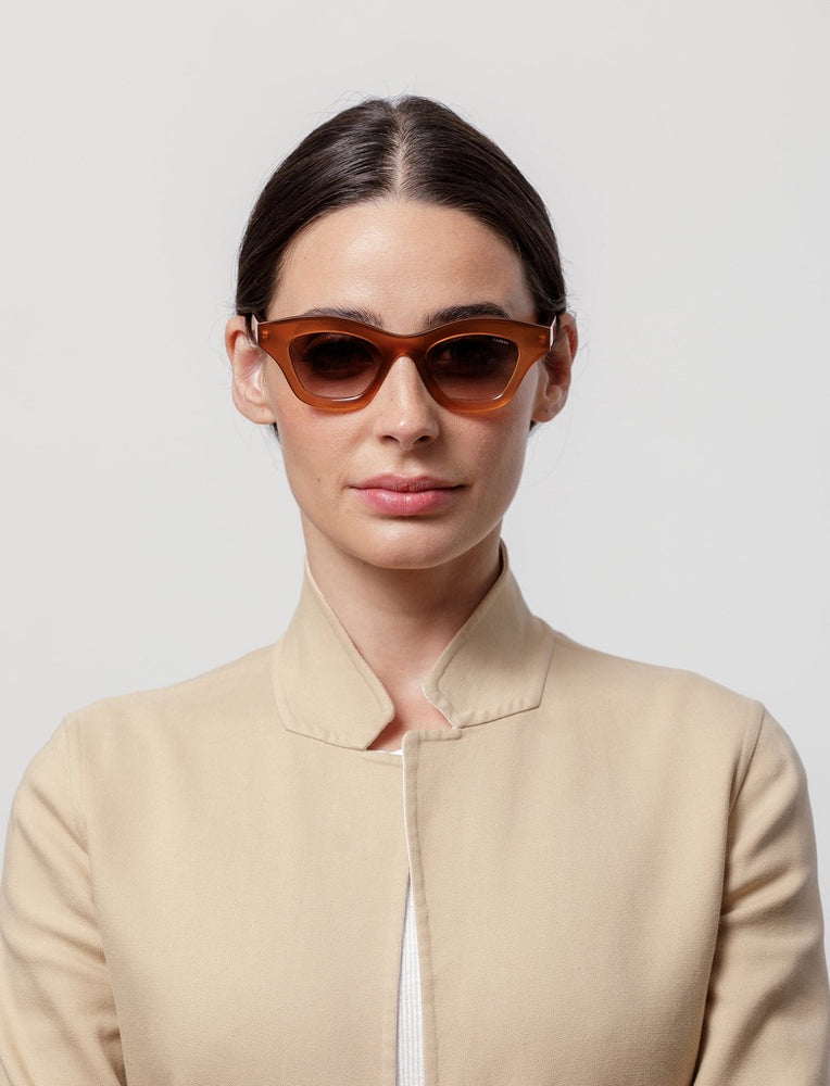 Chic translucent orange cateye sunglasses featuring a gradient fade from amber to light peach. The frames exhibit a modern, architectural design with bold angular edges and a distinctive retro-inspired silhouette. Made with high-quality translucent plastic that catches light beautifully. The gradient brown lenses complement the warm-toned frame perfectly, creating an elegant summer accessory with a vintage feel.