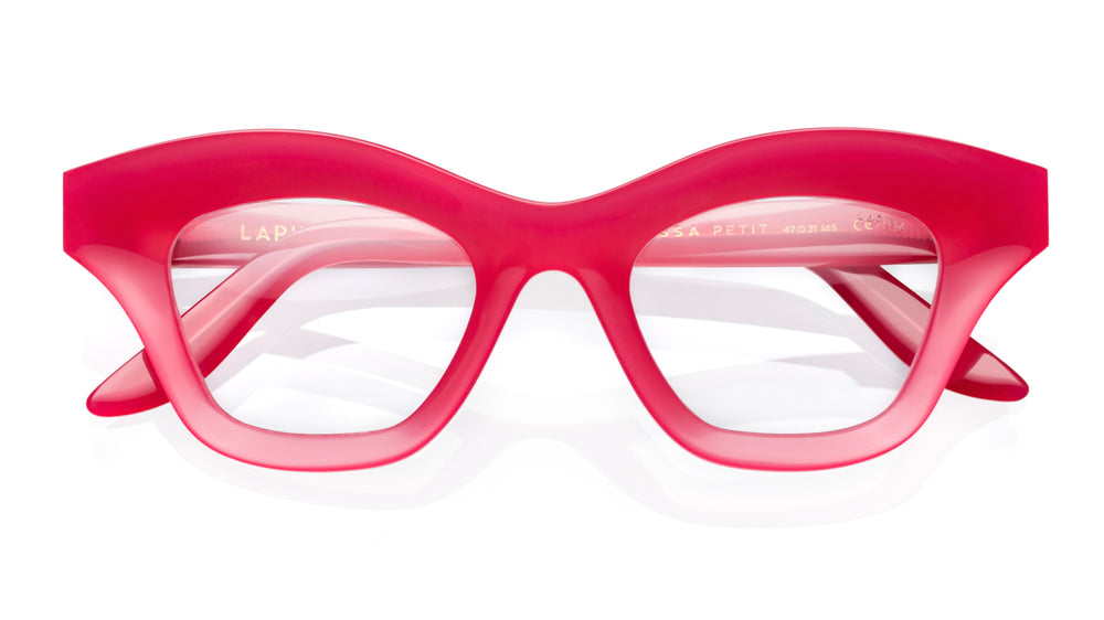 A striking pair of chunky cateye frames in a vibrant translucent pink color. The frames feature a bold, architectural design with substantial thickness and angular corners that create a dramatic, retro-inspired silhouette. The monochromatic pink colorway carries through from the frames to the temples, creating a cohesive, fashion-forward look. The glasses have a modern interpretation of the classic cateye shape with clean lines and a slightly upswept brow line that would complement many face shapes.