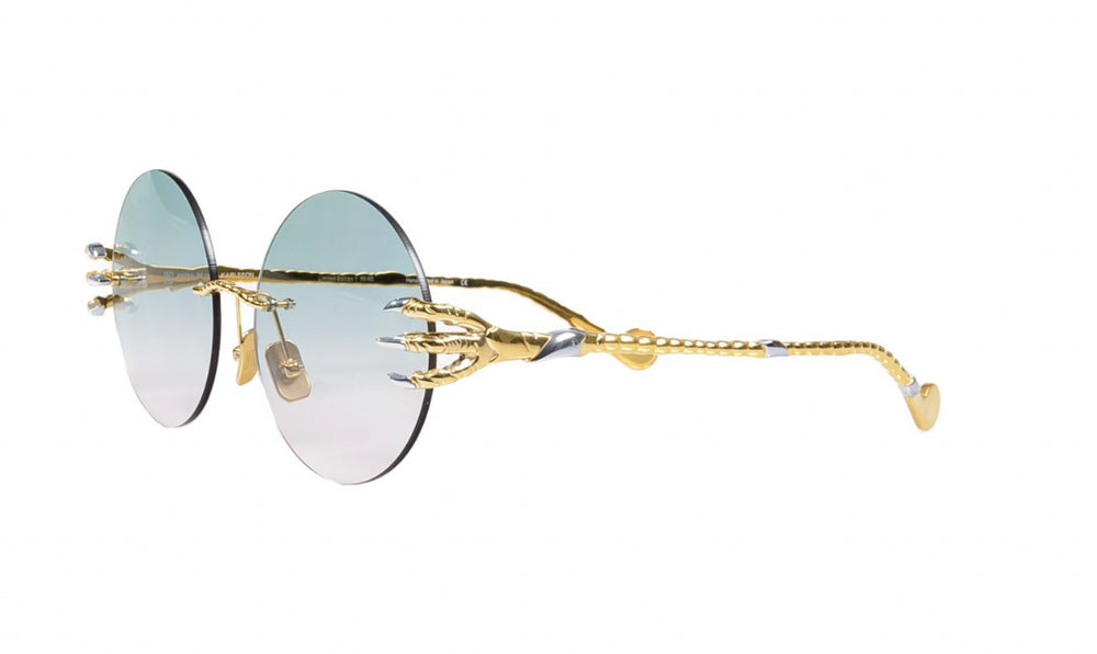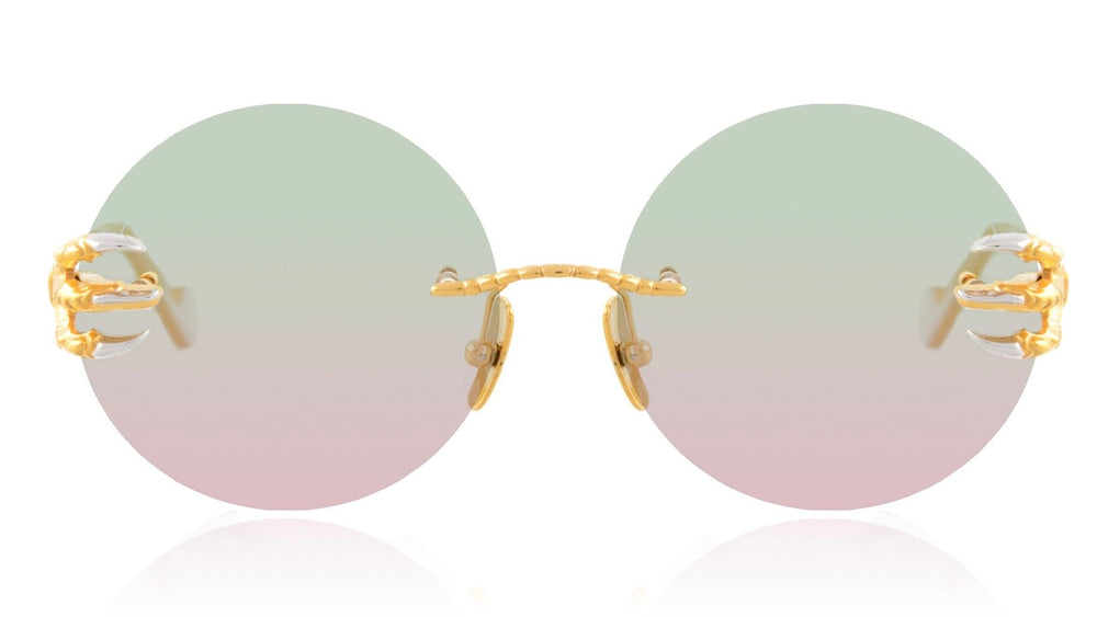 Luxurious rimless round sunglasses featuring a gradient pink to mint green lens tint. The distinctive gold-tone metalwork includes ornate claw-like design elements at the temples that add an avant-garde artistic touch. The frameless design creates an airy, ethereal look while maintaining its high-fashion appeal. The piece demonstrates exquisite craftsmanship with its delicate nose bridge and refined metalwork throughout.