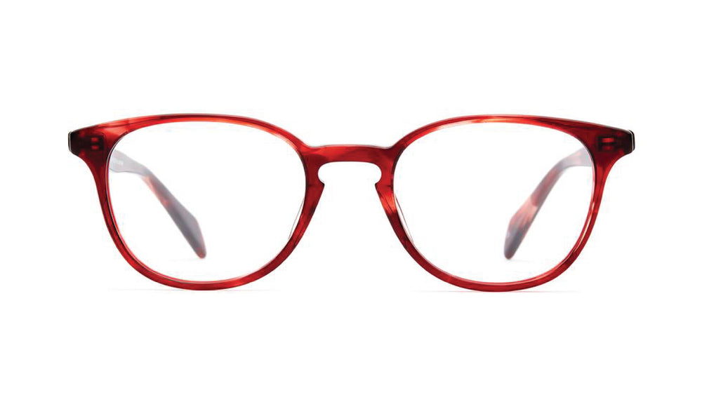 Classic oval-shaped eyeglasses in a translucent ruby red color. The frames feature a contemporary design with smooth rounded edges and a medium-weight construction. The glasses exhibit a sophisticated simplicity with their monochromatic styling and consistent coloring throughout the frame, bridge, and temple arms. The saddle bridge provides comfortable nose support while maintaining the sleek aesthetic of the design. The transparent red acetate material gives these frames a modern, sophisticated look that would complement many face shapes and personal styles.
