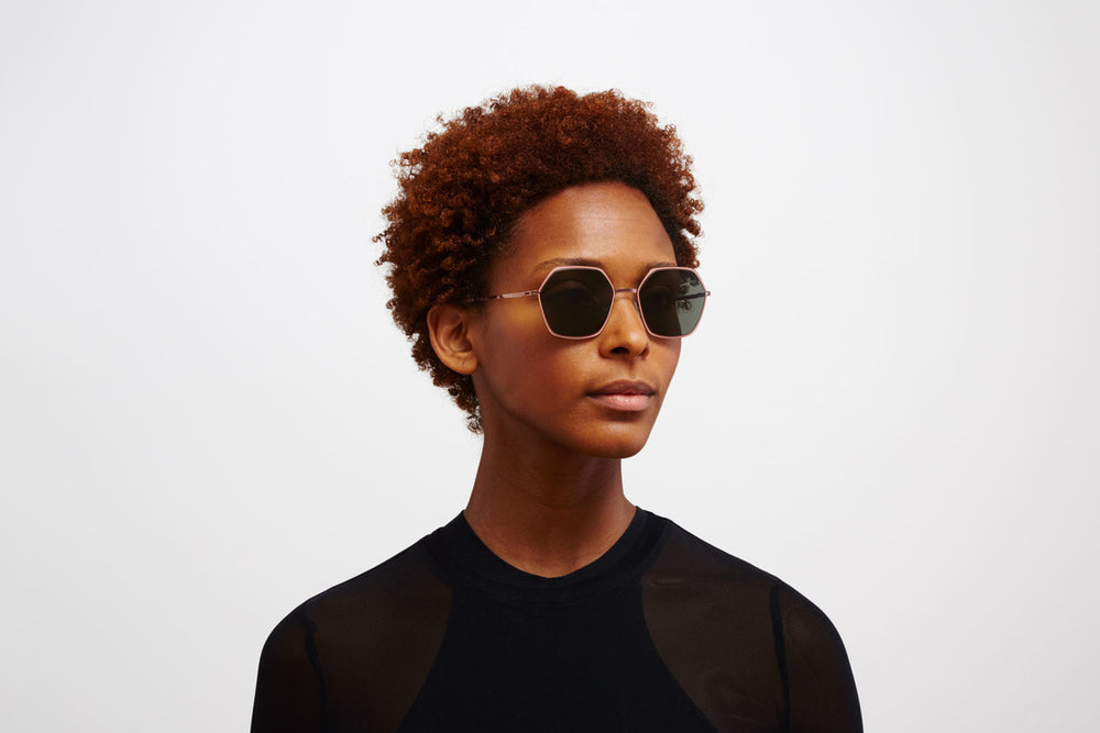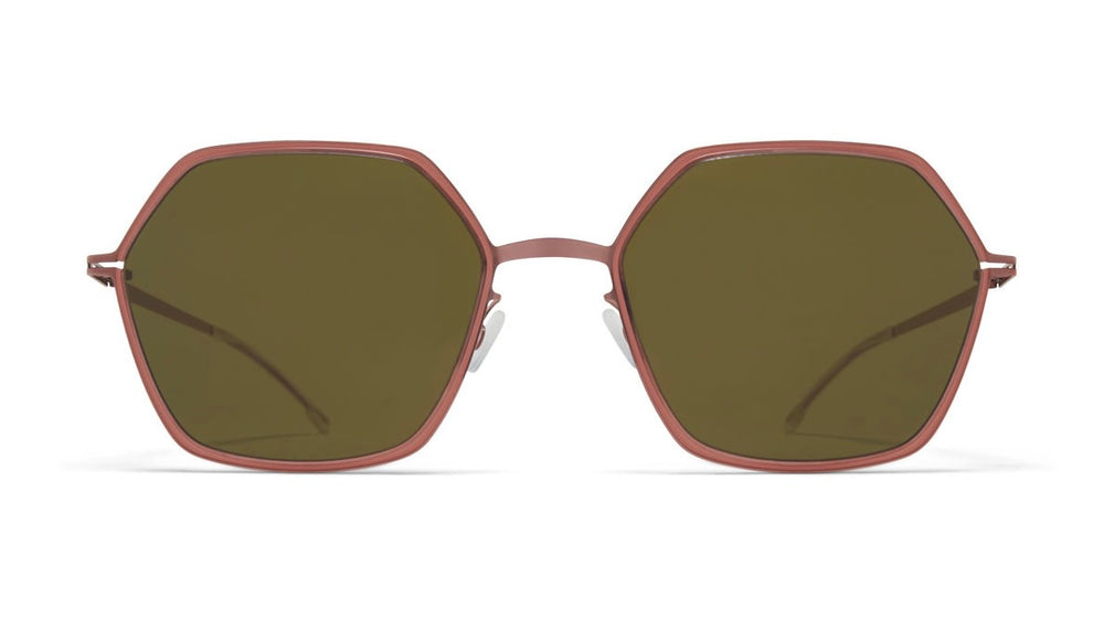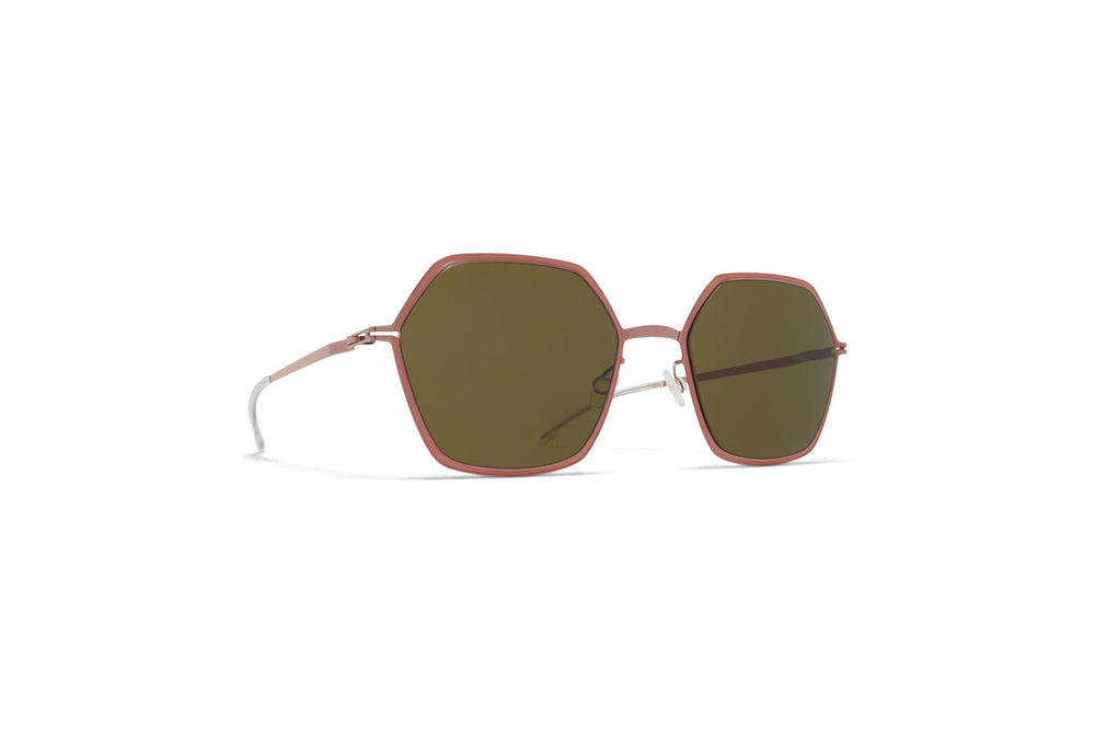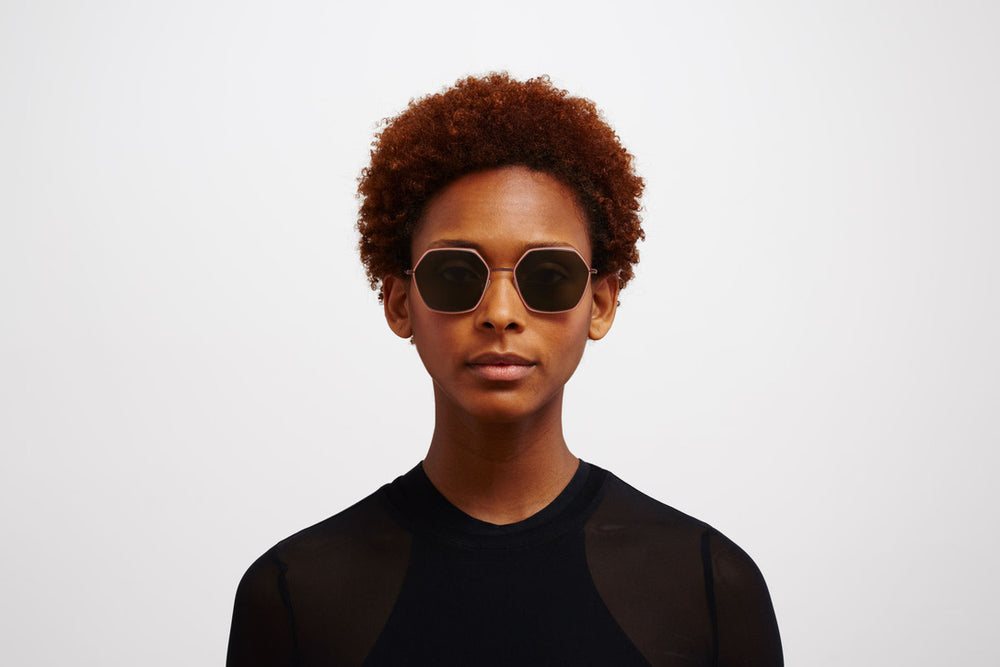 Striking hexagonal sunglasses with a sophisticated metallic bronze finish. The frame features clean geometric lines with angular corners, creating a modern architectural aesthetic. The green-tinted lenses complement the warm bronze tones of the frame, while the thin metal construction ensures a lightweight and comfortable fit. The minimalist design includes sleek nose pads and subtle temple arms that maintain the frames elegant profile. The contemporary styling makes these sunglasses suitable for various face shapes and occasions.