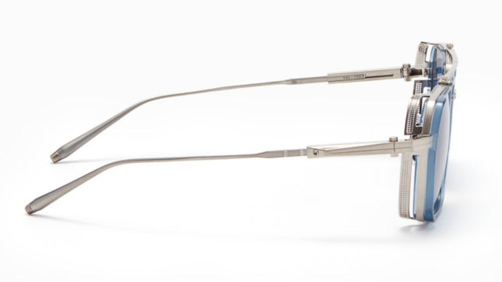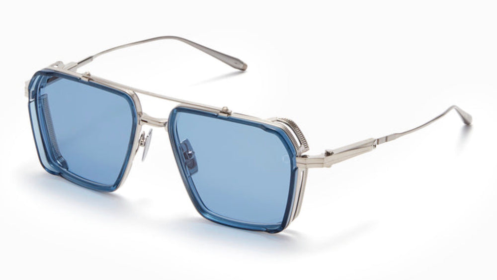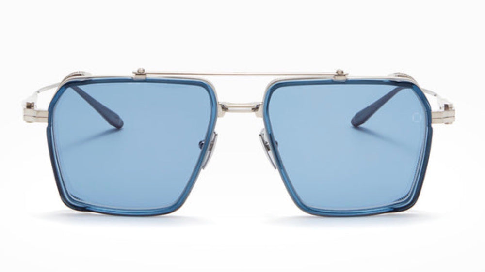 Sleek geometric aviator-inspired sunglasses with a distinctive squared-off shape. Features light blue-tinted lenses in a silver metallic frame with double bridge design. The modern architectural styling combines retro and contemporary elements with clean lines and minimalist details. Premium construction with refined metal hardware and adjustable nose pads for comfort.