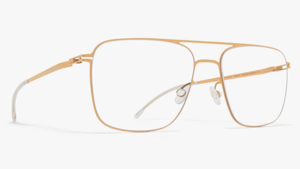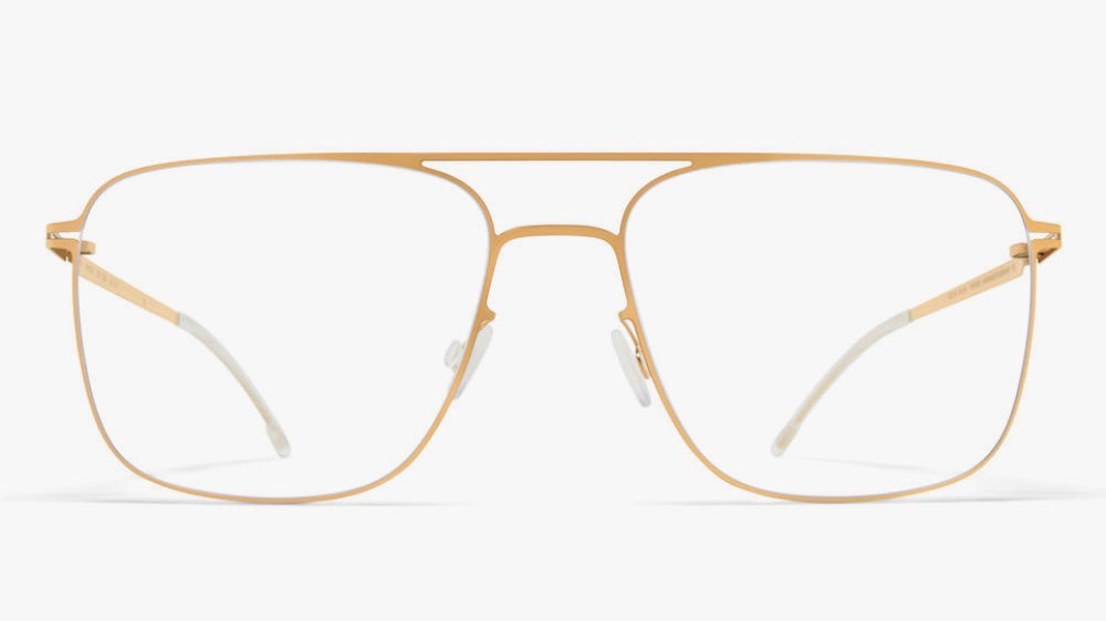 Sleek and minimalist gold-toned aviator-style glasses with a sophisticated squared shape. The thin metal construction gives these frames a lightweight and refined appearance. The design features clean lines with a contemporary double bridge and adjustable nose pads for comfort. The temples are slim and streamlined, matching the overall aesthetic of the frame. These glasses embody modern luxury with their matte gold finish and architectural styling.