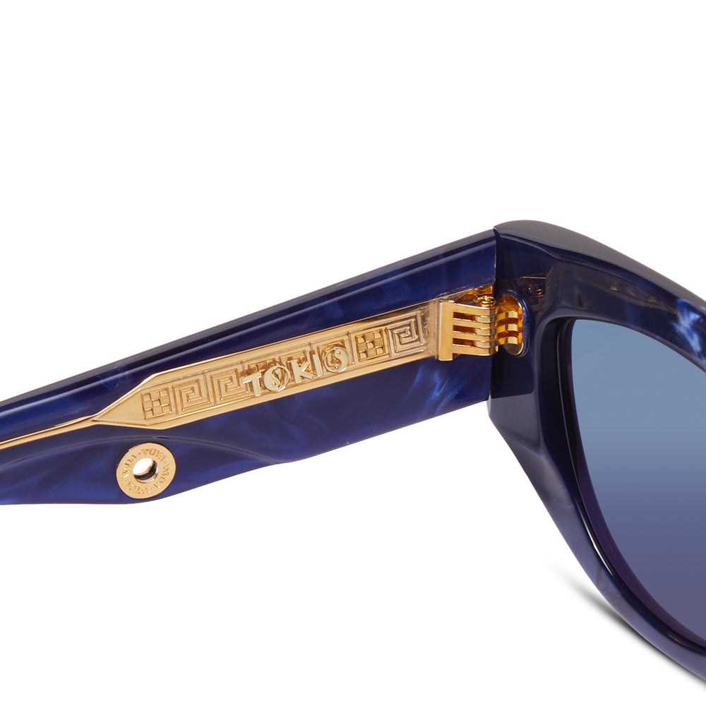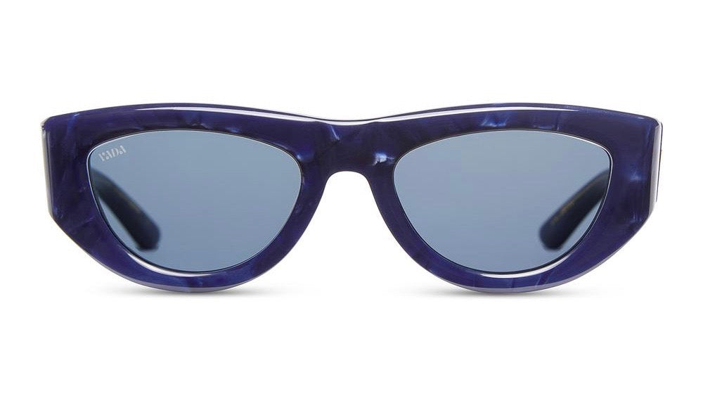 These distinctive VADA EYES sunglasses feature a bold, chunky oval frame in a deep navy blue color. The design has an avant-garde, retro-futuristic aesthetic with an oversized silhouette and smooth, curved edges. The lenses are a matching blue tint, creating a monochromatic look. The frame has a glossy finish and substantial thickness that makes a strong style statement. The design has a unisex appeal that works well for fashion-forward individuals looking for a statement piece.