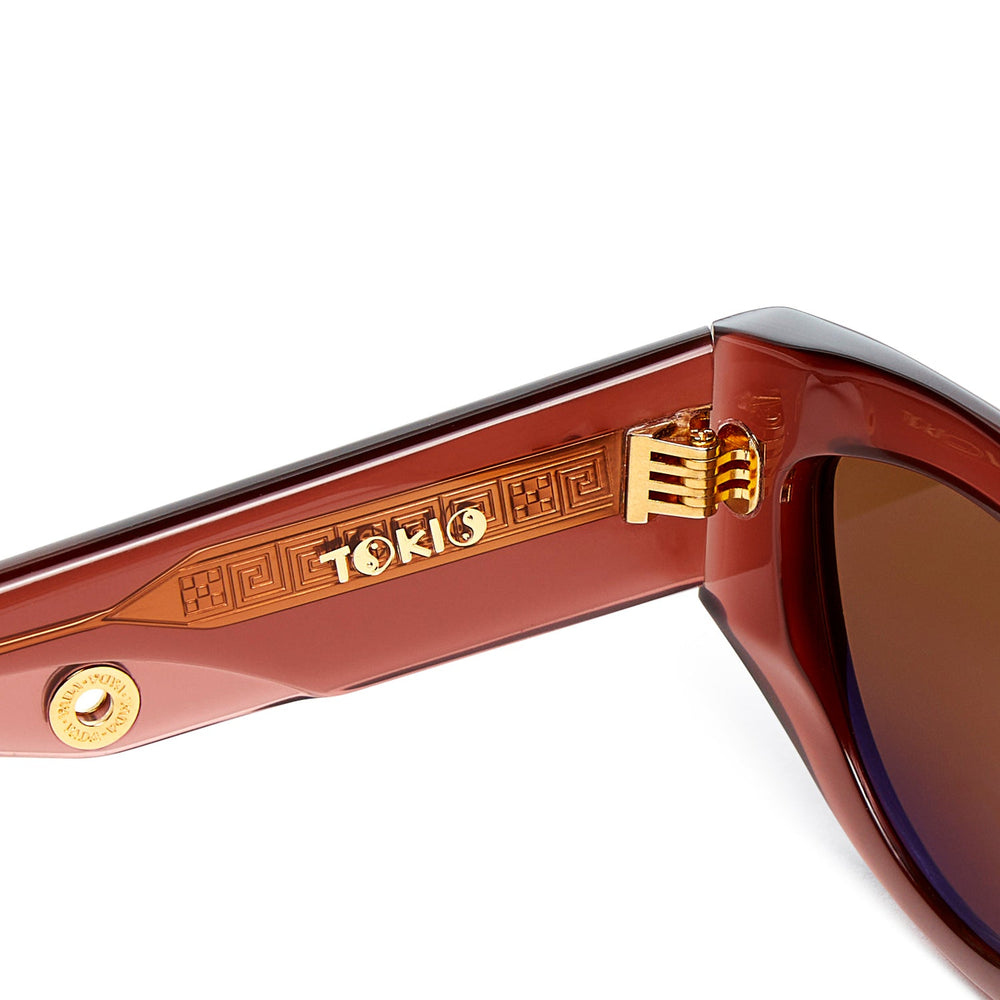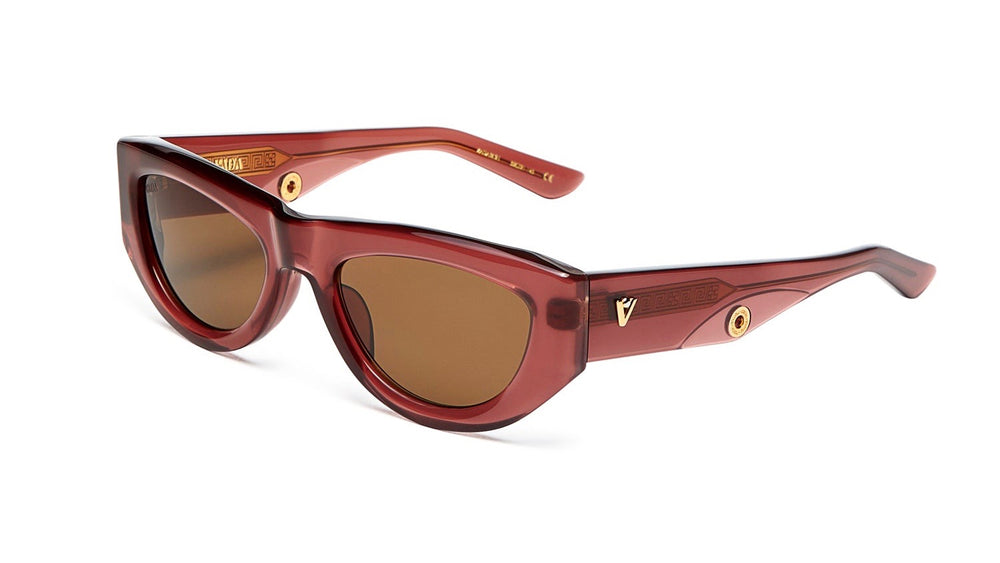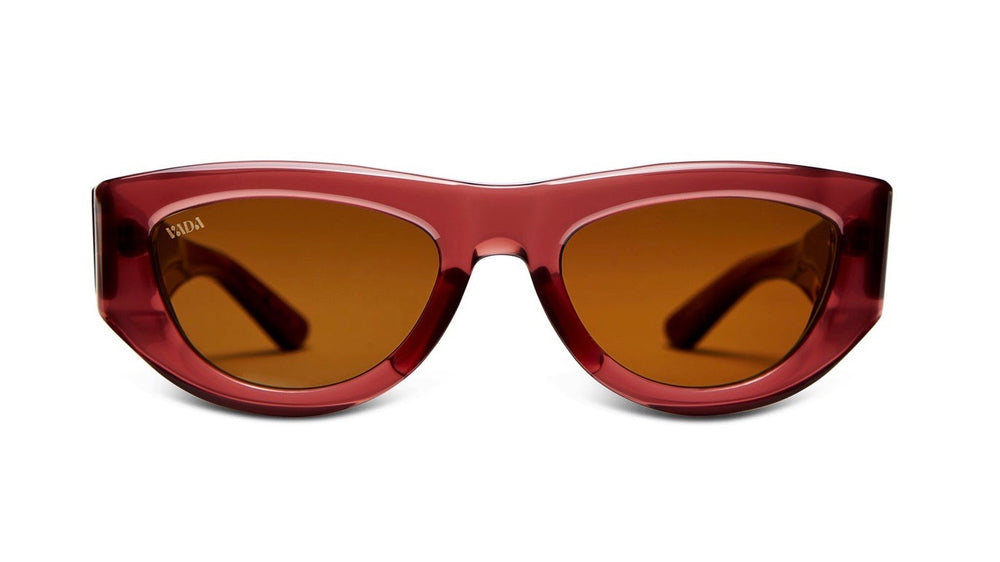 These striking sunglasses feature a bold geometric silhouette with a distinctive burgundy-red translucent frame. The thick, substantial construction creates a dramatic, avant-garde look with angular lines. The brown-tinted lenses provide excellent sun protection while complementing the frames warm tones. The design has an architectural quality with clean lines and a contemporary aesthetic that makes a strong fashion statement. The chunky saddle bridge and wide temple arms maintain the bold proportions throughout the design.