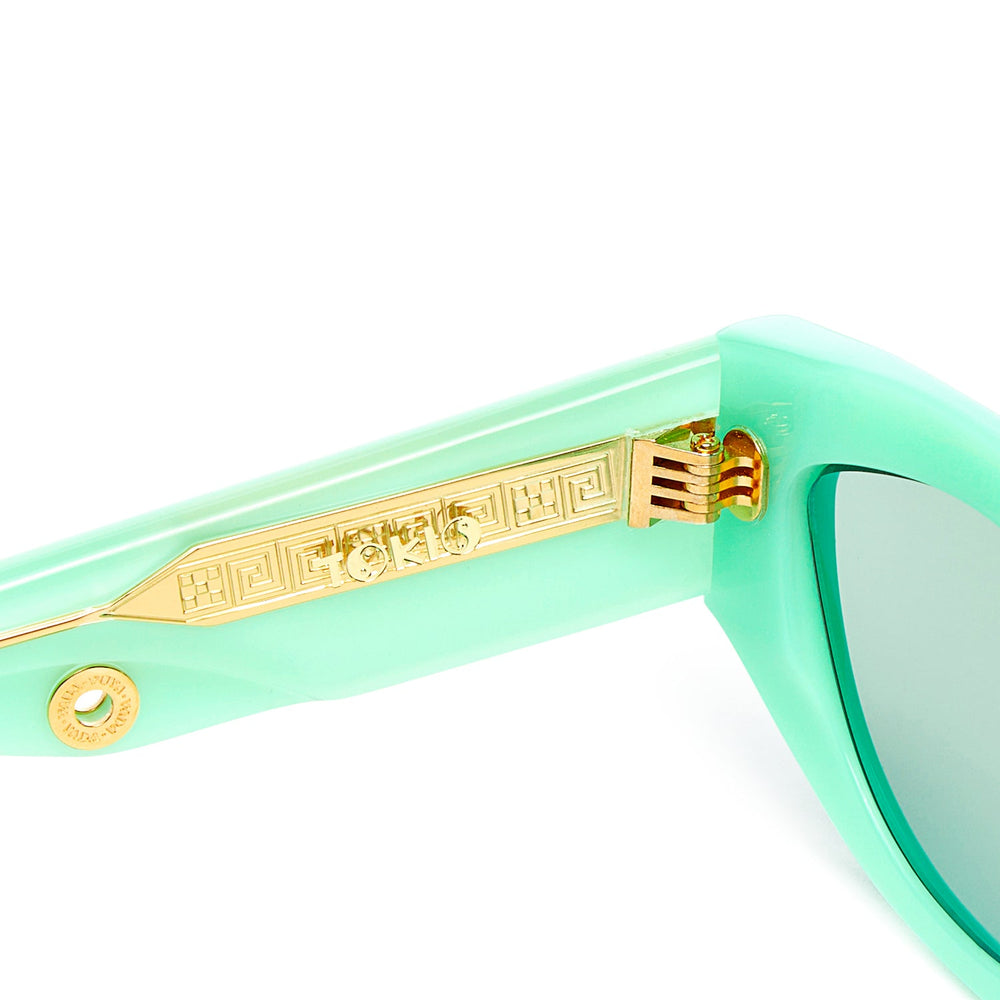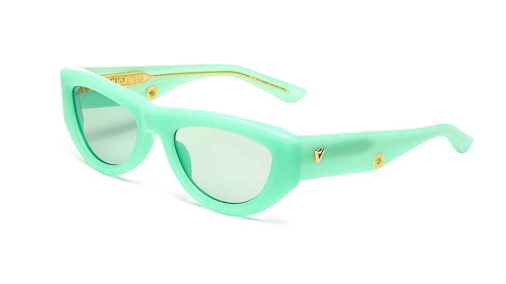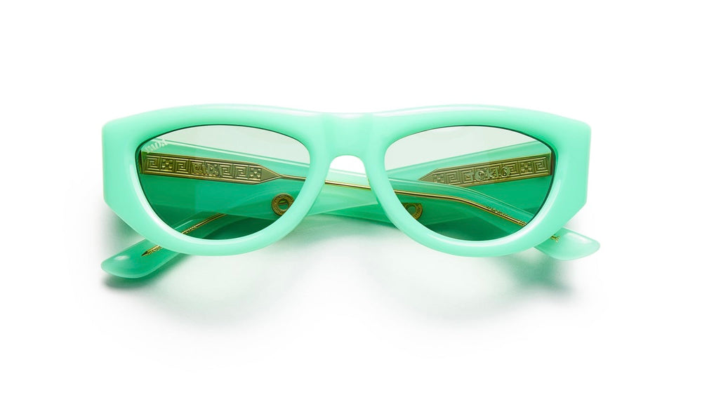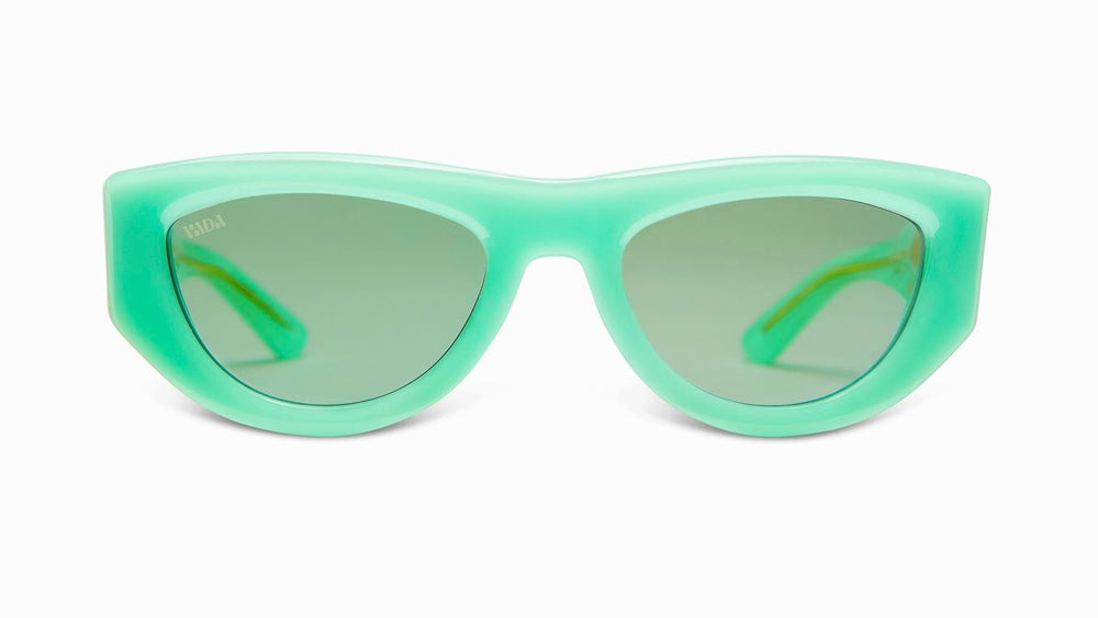 Bold, chunky mint green sunglasses with an avant-garde geometric shape reminiscent of futuristic fashion. The frames feature a distinctive thick profile with an oversized, angular design that makes a strong style statement. The monochromatic mint green colorway extends throughout the frame, creating a cohesive, modern look. The lenses appear to be tinted in a matching green hue with what seems to be a mirrored finish, perfect for both sun protection and fashion-forward styling. The design speaks to contemporary streetwear trends while maintaining a bold, artistic aesthetic.