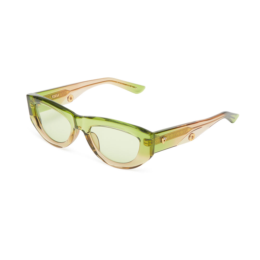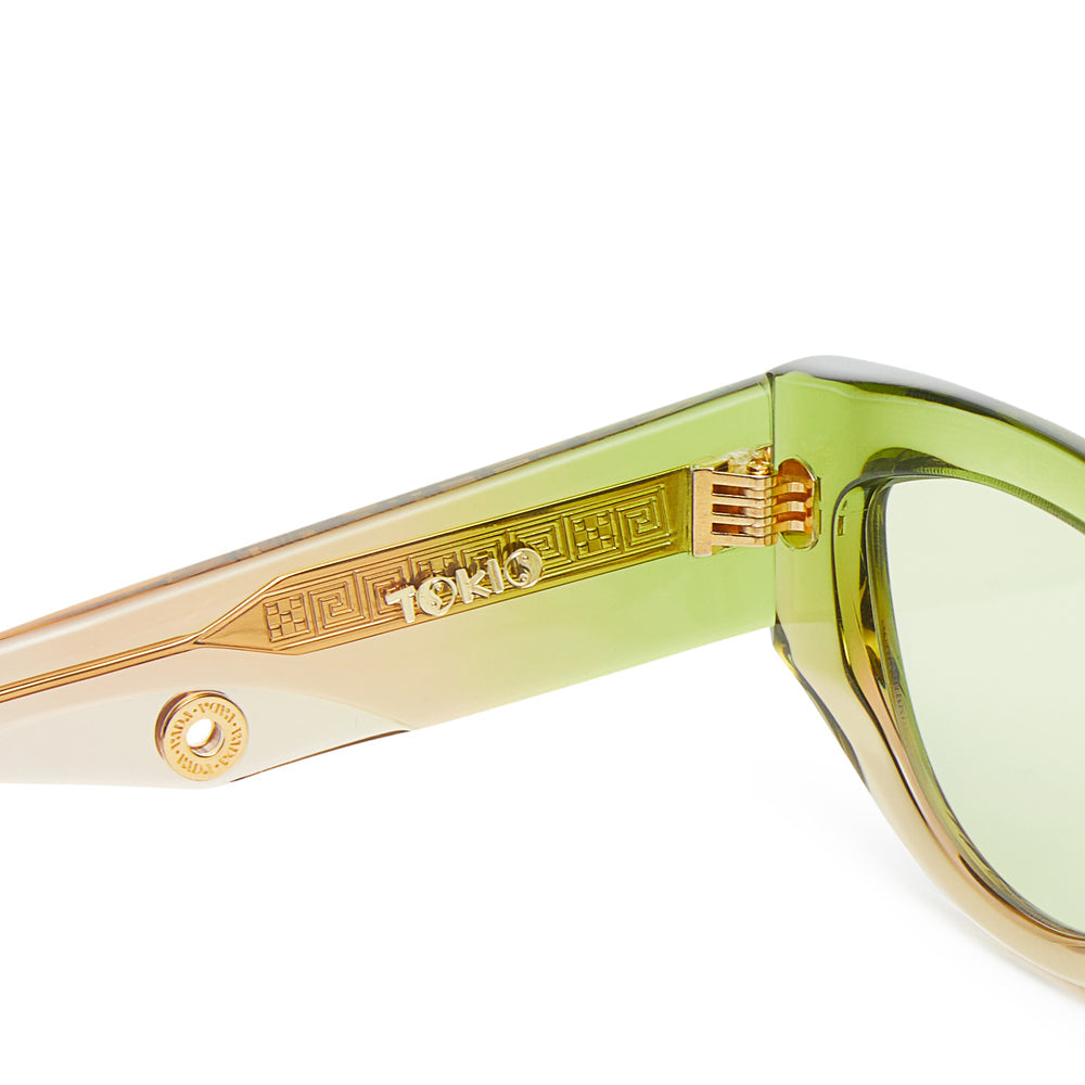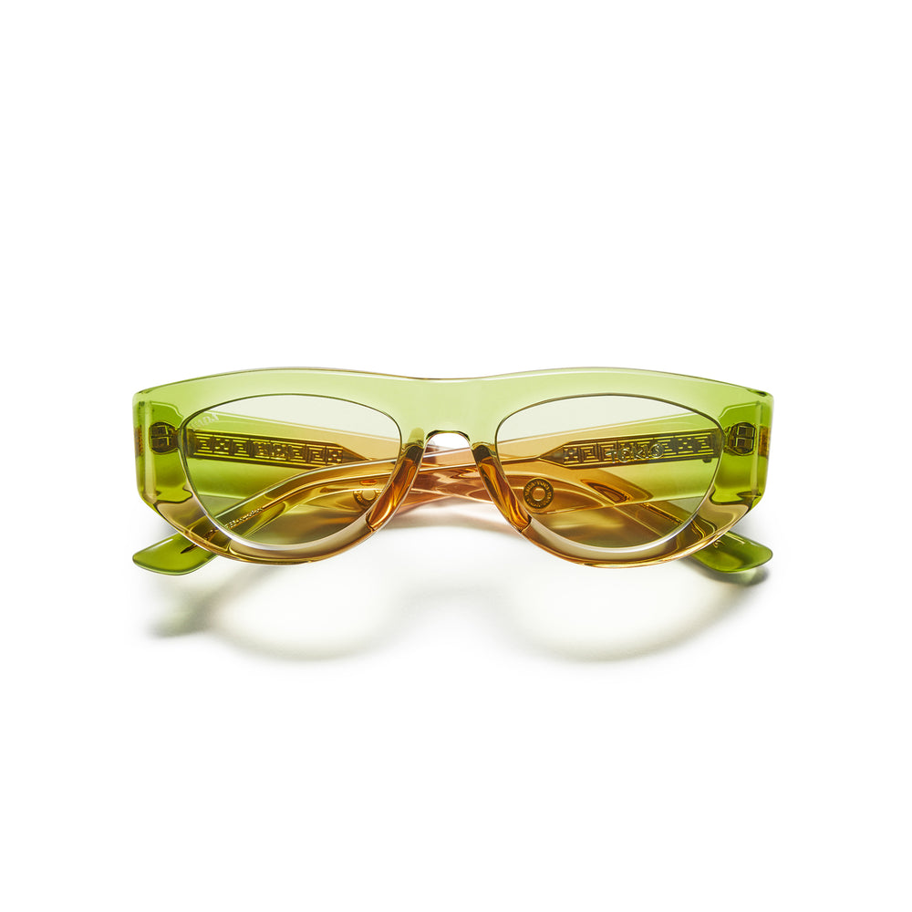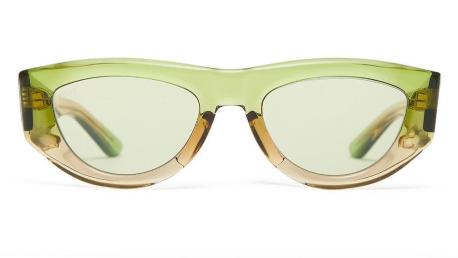Bold two-tone geometric sunglasses featuring a distinctive gradient design transitioning from lime green to champagne beige. The frame has a contemporary avant-garde aesthetic with a chunky silhouette and seamless color transition. Made from transparent plastic with a glossy finish, these statement sunglasses offer a fresh take on modern eyewear with their architectural lines and eye-catching ombré effect.