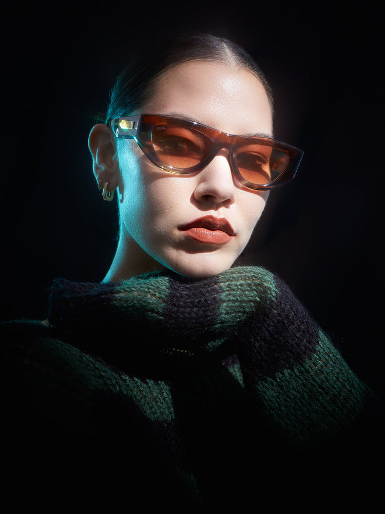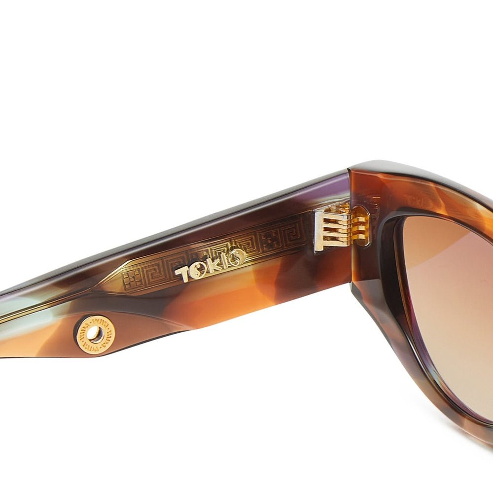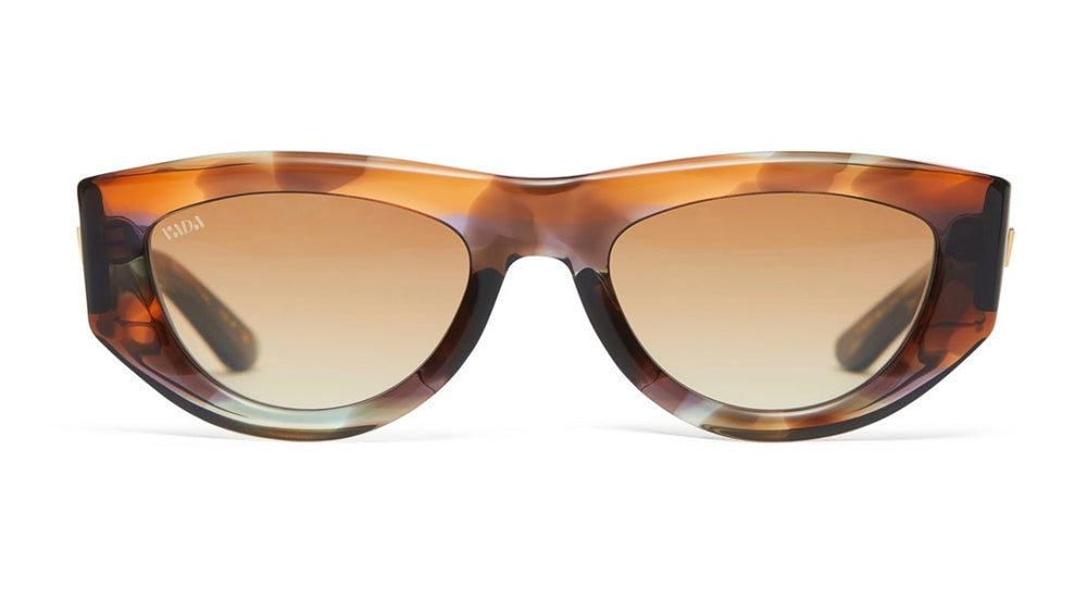 These are bold, avant-garde sunglasses featuring an angular geometric shape with an upswept design. The frames showcase a rich tortoise-brown gradient coloring that transitions beautifully from darker to lighter tones. The lenses are gradient brown, complementing the frames aesthetic perfectly. The design has a distinctly contemporary and fashion-forward feel with substantial frame thickness and clean lines. The silhouette suggests a bold, statement-making accessory that would suit those looking for a unique, high-fashion eyewear option. The construction appears sturdy and well-crafted, with seamless integration between the front frame and temple arms.