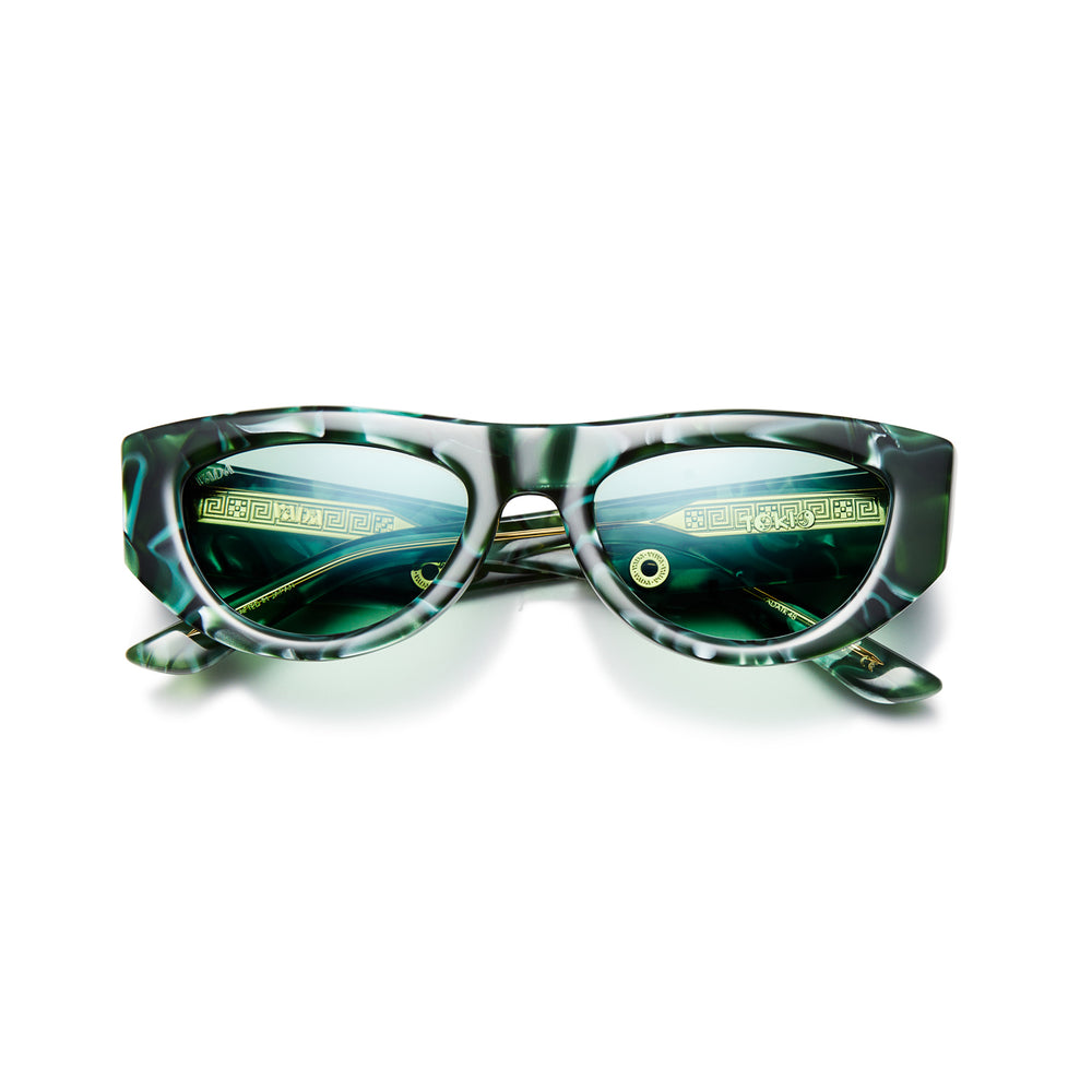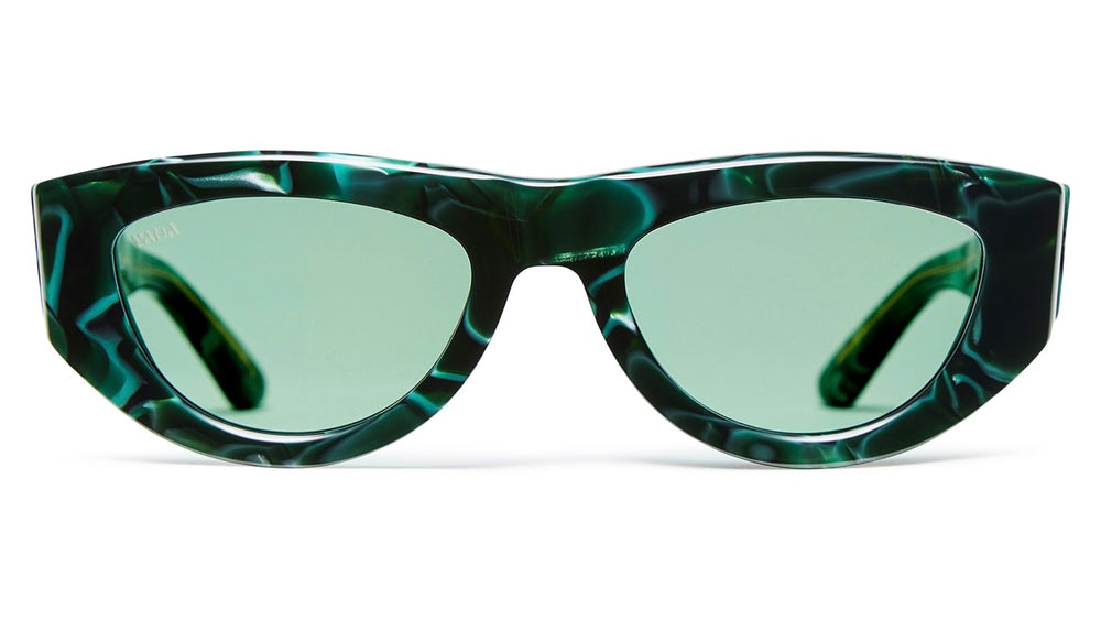 These are bold, avant-garde sunglasses featuring a distinctive geometric shape with an angular, chunky frame design. The frames showcase a striking marbled emerald green pattern throughout, giving them a luxurious, jewel-like quality. The lenses are a matching soft green tint. The design has a contemporary, fashion-forward aesthetic with substantial frame thickness and clean architectural lines. The overall silhouette suggests a statement piece that combines modern styling with artistic flair.