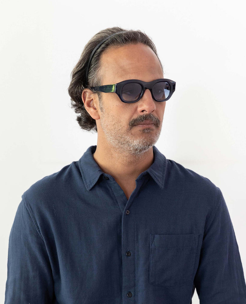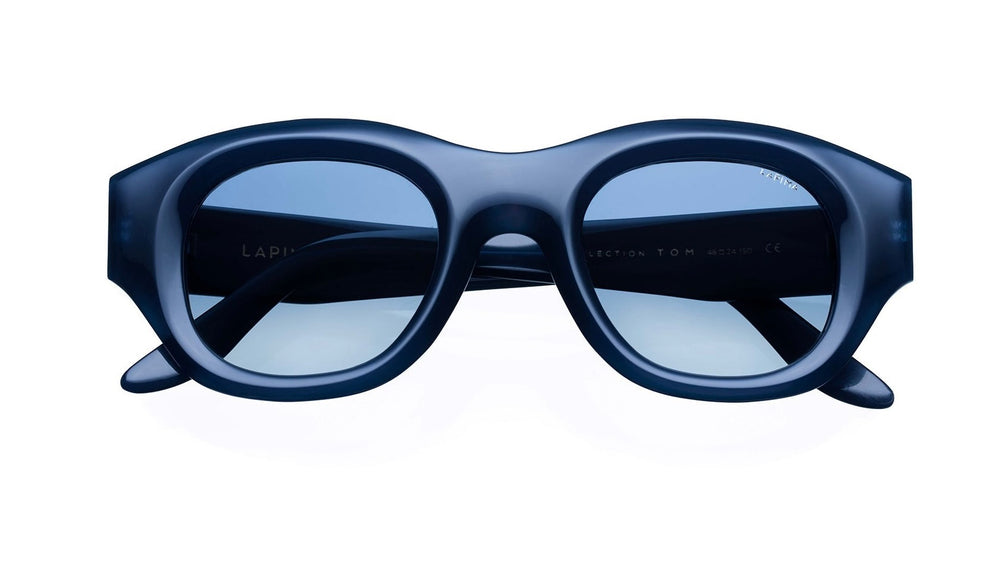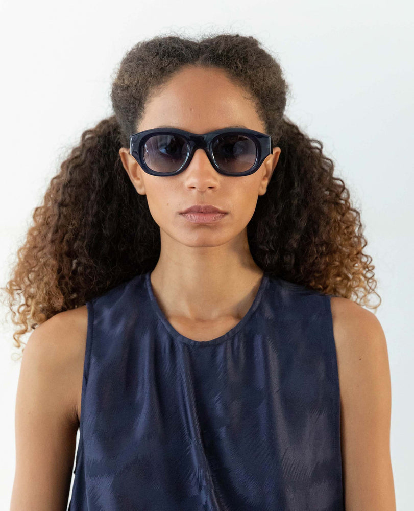 These are bold, chunky round sunglasses in a deep navy blue color with a retro-inspired silhouette. The frames feature a substantial, architectural build with a prominent brow line and thick temples. The design has a sophisticated yet casual aesthetic that would suit various face shapes. The monochromatic blue tinted lenses complement the frame color perfectly, creating a cohesive look. The saddle bridge adds comfort while maintaining the substantial styling. These sunglasses combine vintage inspiration with modern craftsmanship, making them a statement piece thats both fashionable and functional.