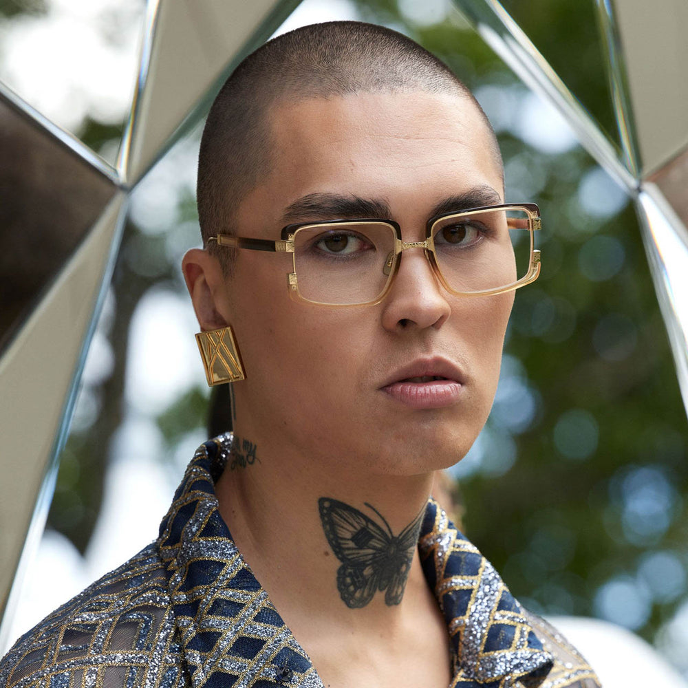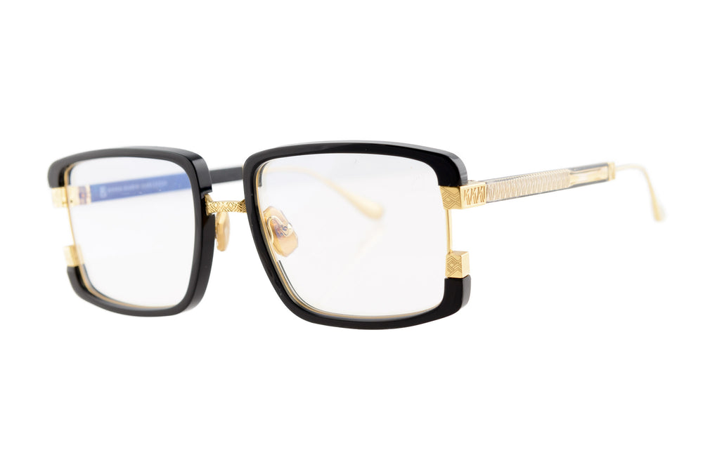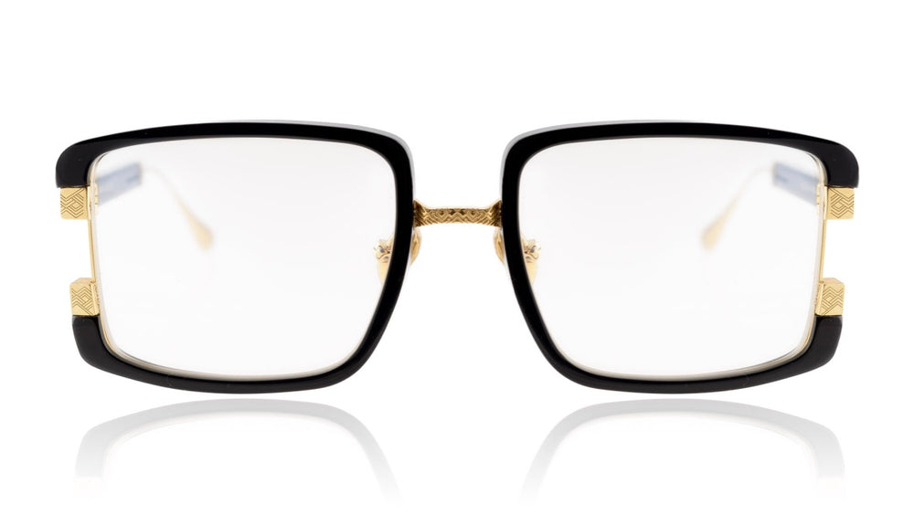 A sophisticated pair of eyeglasses featuring a bold square frame with black accents and luxurious gold detailing. The frame combines black edges with intricate gold metalwork on the temples and bridge, creating an elegant contrast. The design showcases a modern geometric aesthetic with clean lines and a substantial presence, while maintaining a balanced proportion. The temple arms feature distinctive textured gold patterns, adding a touch of luxury to the overall design. These glasses project a strong, confident style suitable for formal and professional settings.