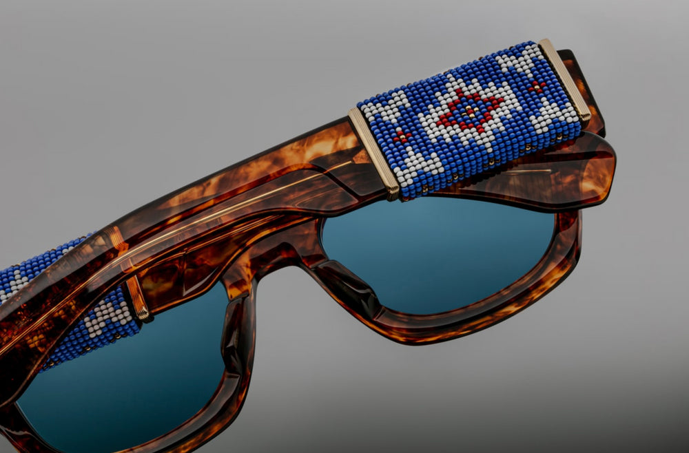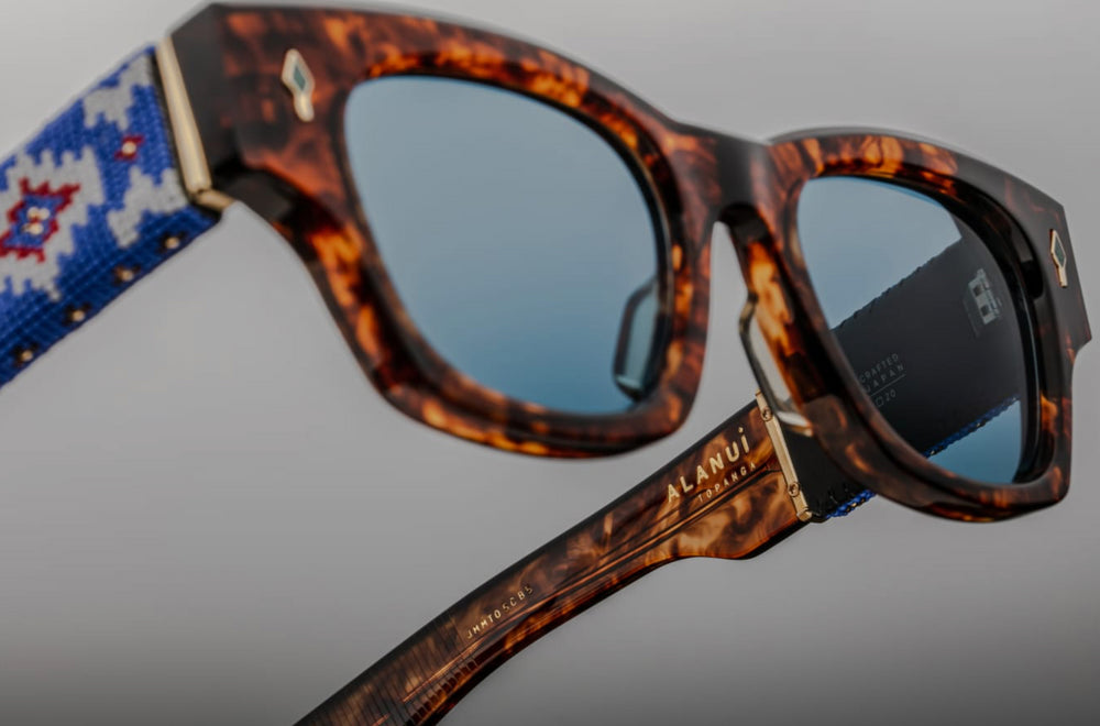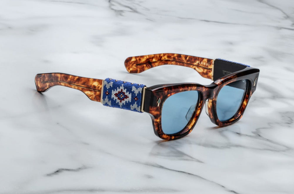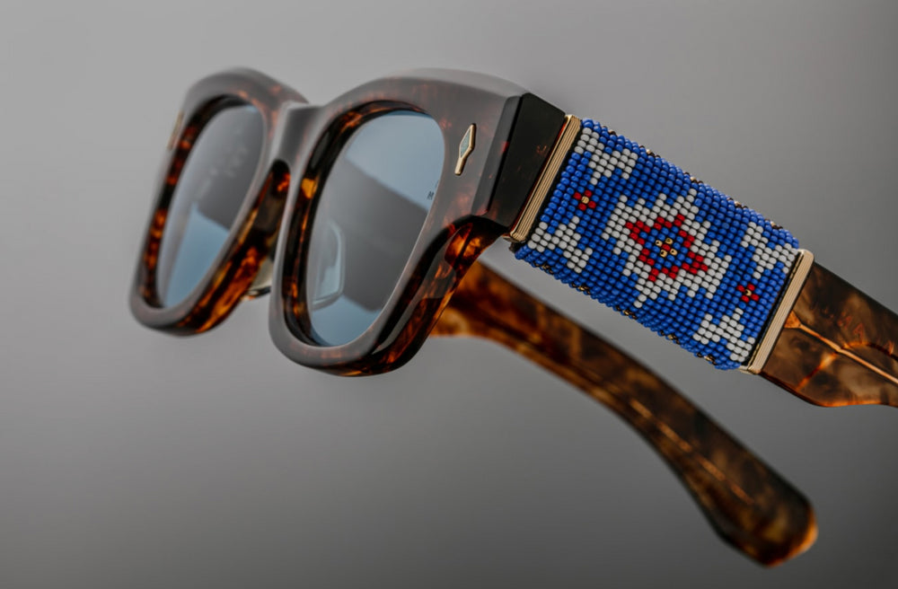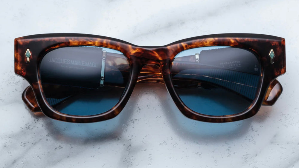 A luxurious pair of Jacques Marie Mage sunglasses in a bold square shape featuring a rich tortoise acetate frame. The chunky, statement design showcases classic proportions with substantial temple arms and a prominent saddle bridge. The blue-tinted lenses add a contemporary touch while providing excellent sun protection. The frames feature small diamond-shaped silver accents at the temples, adding an elegant detail to these sophisticated sunglasses. The substantial build quality and attention to detail are hallmarks of the brands premium positioning.