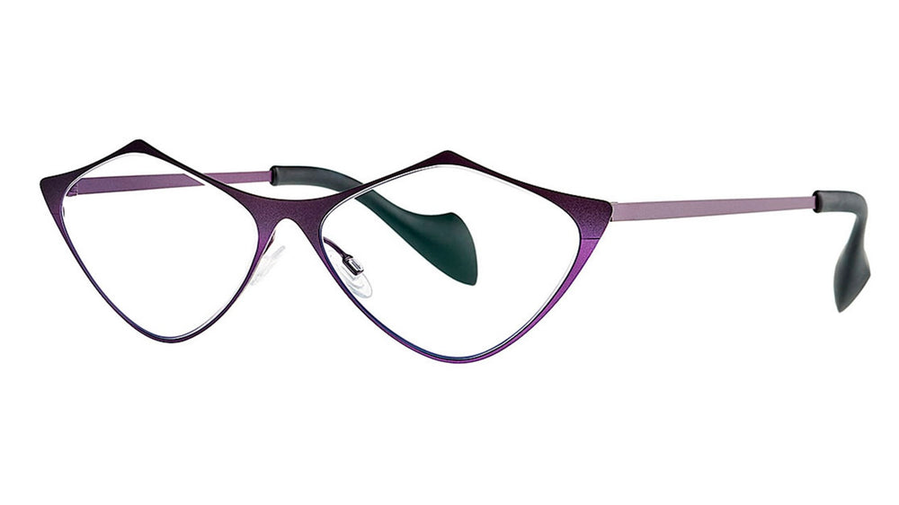 Sleek and modern cat-eye frames in metallic purple with a distinctive angular shape. The frames feature a thin profile with elegant lines that sweep upward at the temples. The design incorporates black temple tips for comfort and style contrast. The sophisticated silhouette offers a contemporary take on the classic cat-eye style, perfect for fashion-forward professionals.