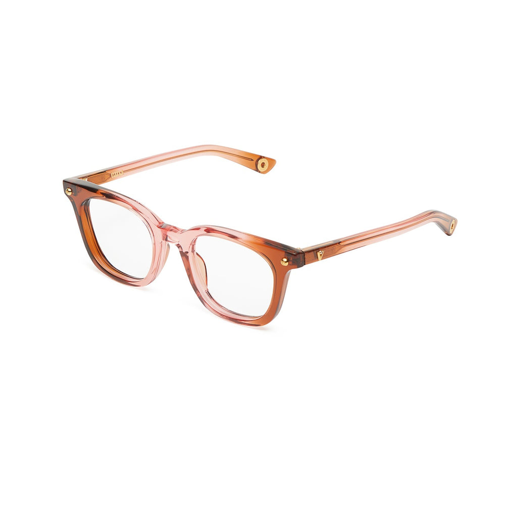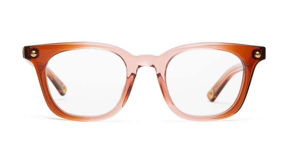 A stylish pair of translucent orange-tinted square frames with a modern, minimalist aesthetic. The frames feature a subtle gradient effect from a deeper orange at the top to a lighter shade towards the bottom. Small decorative gold circular accents appear on both temples near the front of the frame, adding a subtle touch of sophistication. The frame has clean lines and a contemporary silhouette that would suit most face shapes.