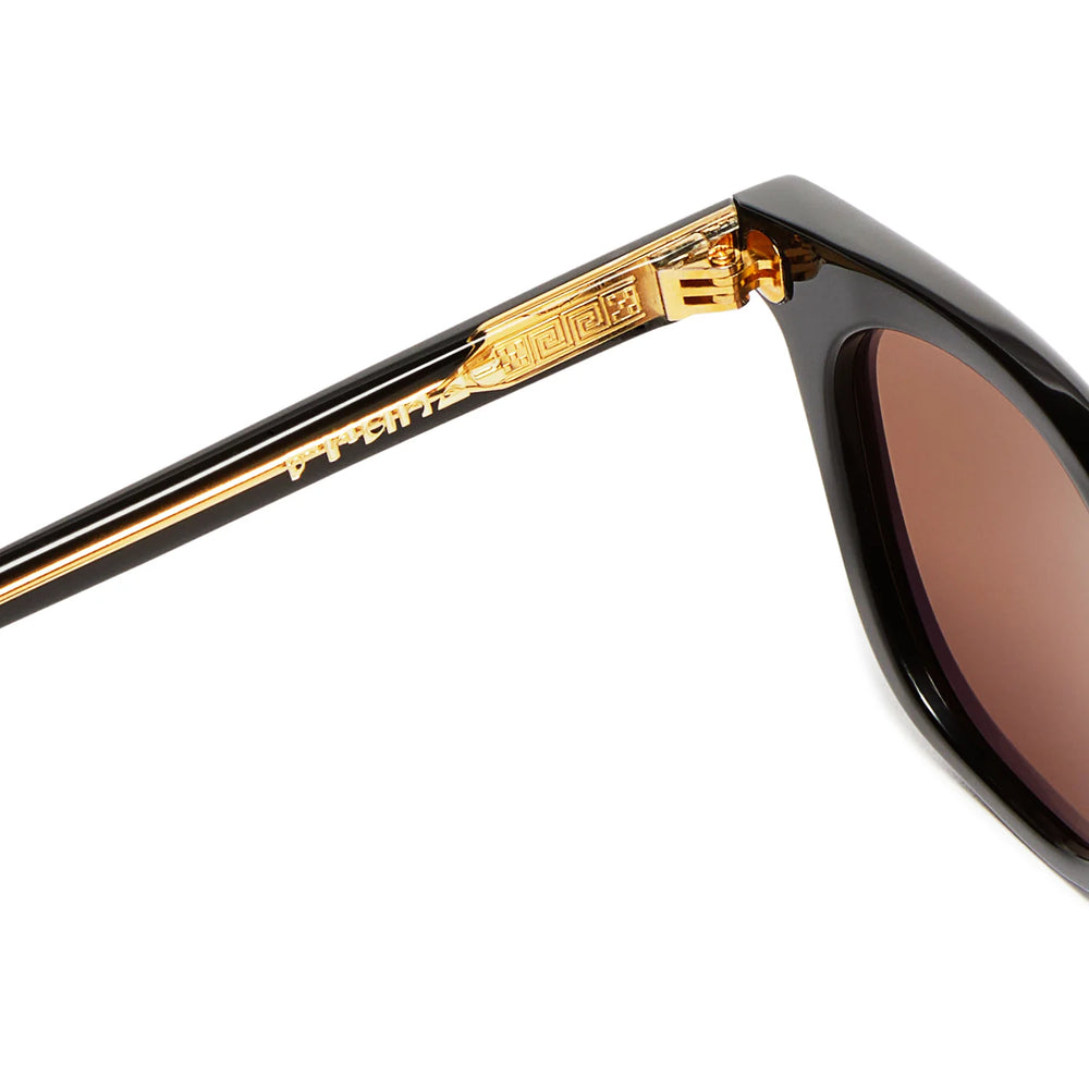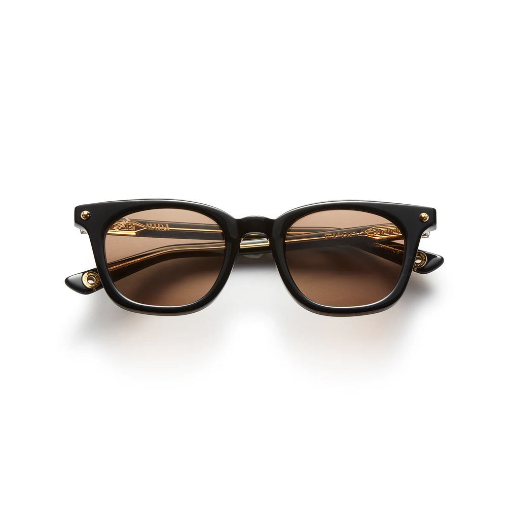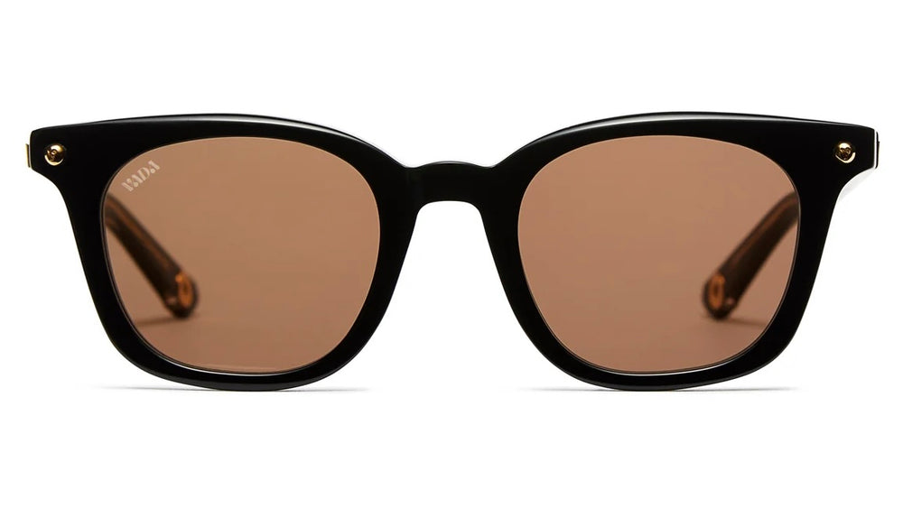 Classic square-shaped sunglasses with a sleek black frame and amber-tinted lenses. The design features subtle gold-tone hardware accents at the temples. The frame has a refined, contemporary silhouette with clean lines and a sophisticated finish, making it versatile for everyday wear. The medium-weight construction offers durability while maintaining comfort.
