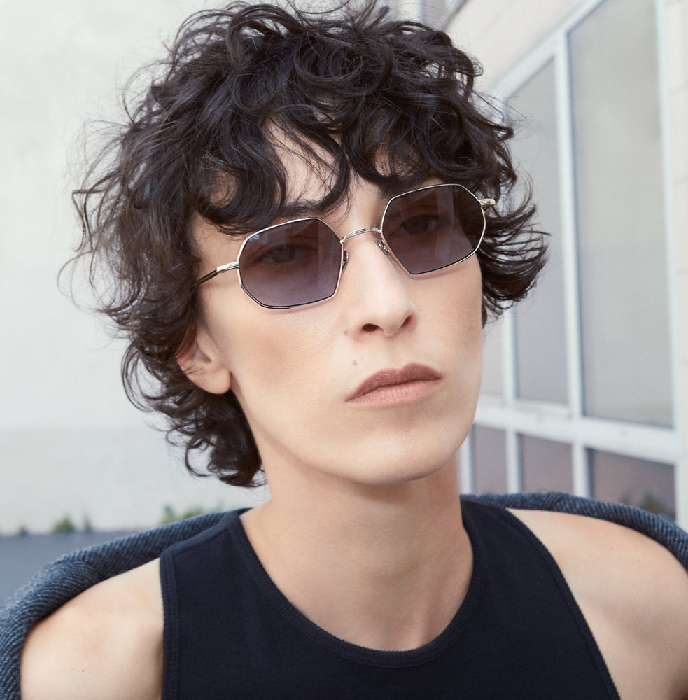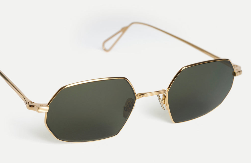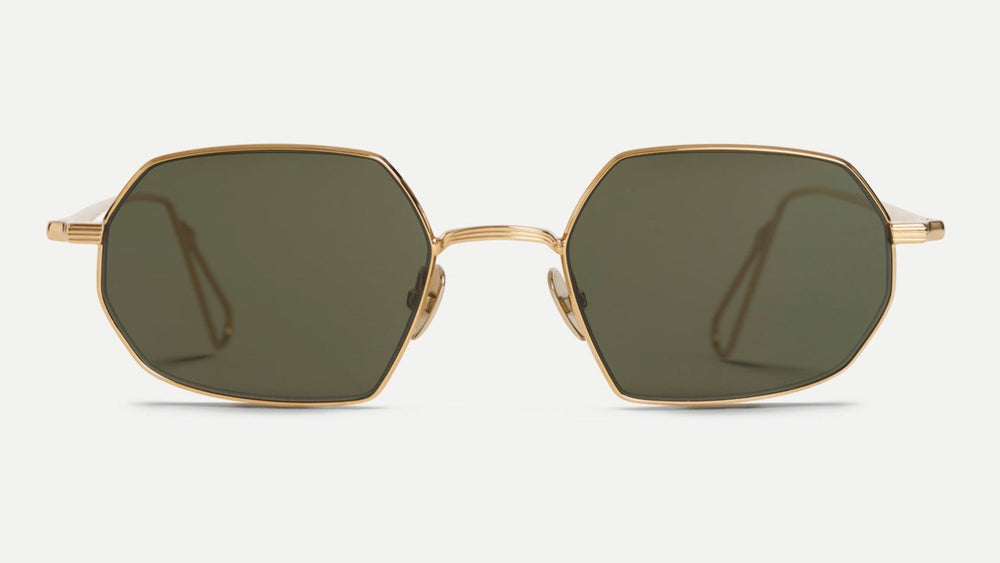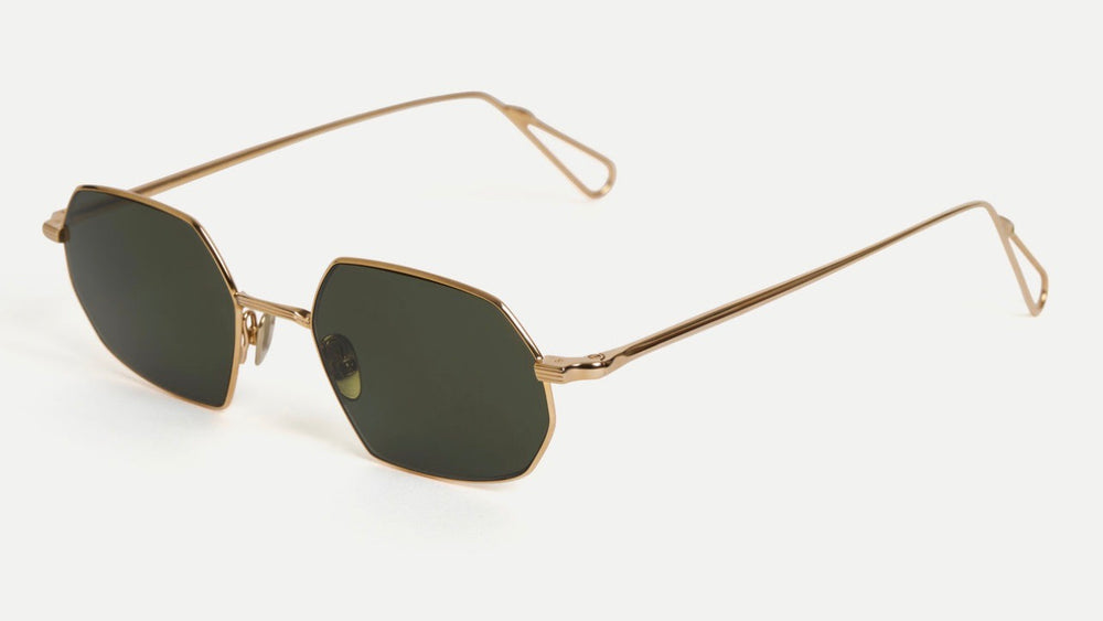 Elegant hexagonal sunglasses with a refined gold metal frame and sophisticated dark green lenses. The design features clean lines with angular geometric shapes, thin temple arms, and delicate nose pads. The sunglasses exhibit a minimalist yet luxurious aesthetic with excellent attention to detail in the metalwork, particularly around the frame corners and bridge construction. The style bridges vintage inspiration with contemporary design sensibilities, making them suitable for both formal and casual wear.