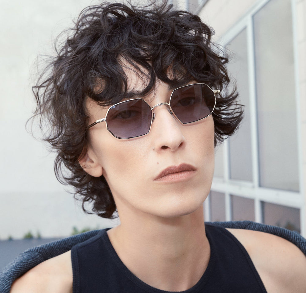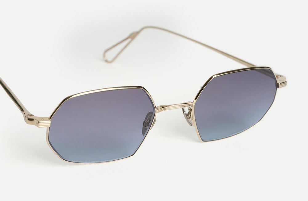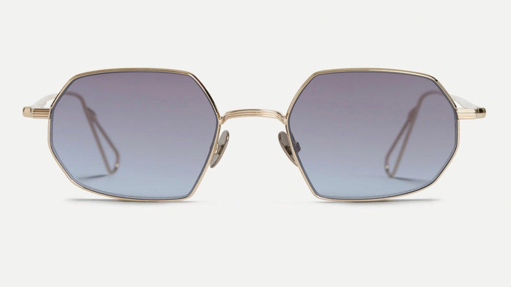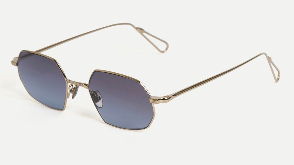 These luxurious hexagonal sunglasses feature a delicate gold metal frame with an elegant gradient blue-grey lens tint. The design showcases clean geometric lines with angular corners, creating a sophisticated and modern aesthetic. The thin temple arms and minimalist nose bridge complement the overall refined look, making these sunglasses both fashionable and versatile for everyday wear.