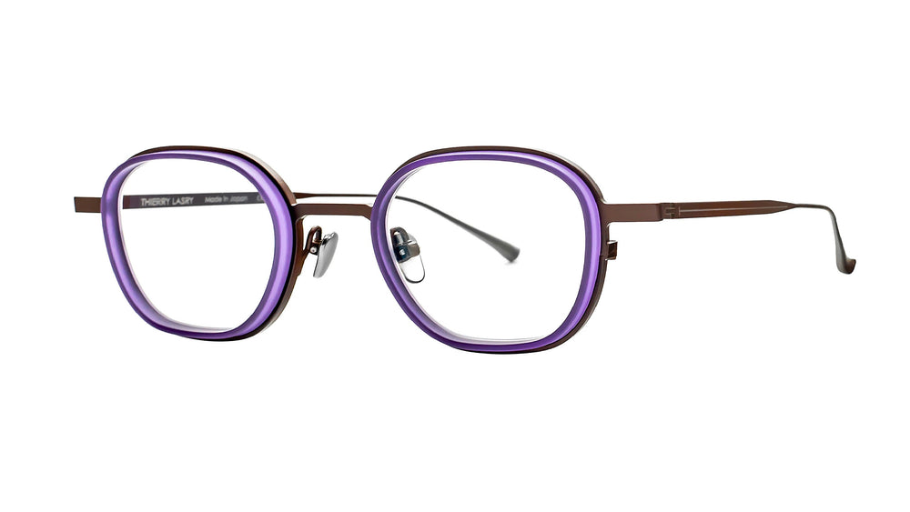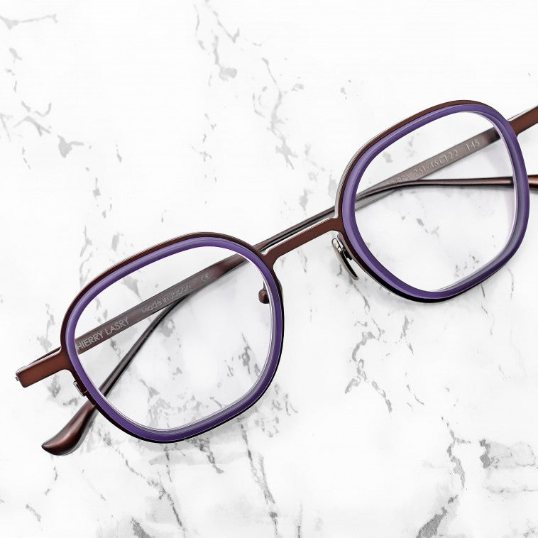 These distinctive geometric frames feature a unique double-layered design with a purple outer rim and bronze metal inner frame. The temple arms are sleek and minimalist in bronze-colored metal, creating an interesting contrast with the bold front design. The glasses have a contemporary, architectural quality with clean lines and a sophisticated color combination that makes them suitable for fashion-forward individuals. The design balances between being a statement piece while maintaining professional wearability.