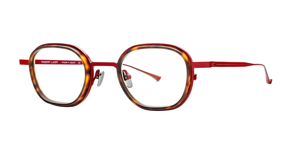 A sophisticated fusion of vintage and modern design elements, featuring a geometric frame with tortoise acetate inlays around red metal rims. The eyeglasses showcase a distinctive double-layered construction where tortoiseshell acetate frames beautifully contrast with the metallic red underlying structure. The temples are sleek and minimalist in matching red metal, creating a refined and contemporary aesthetic. The design exhibits excellent craftsmanship with precise detailing and smooth transitions between materials.