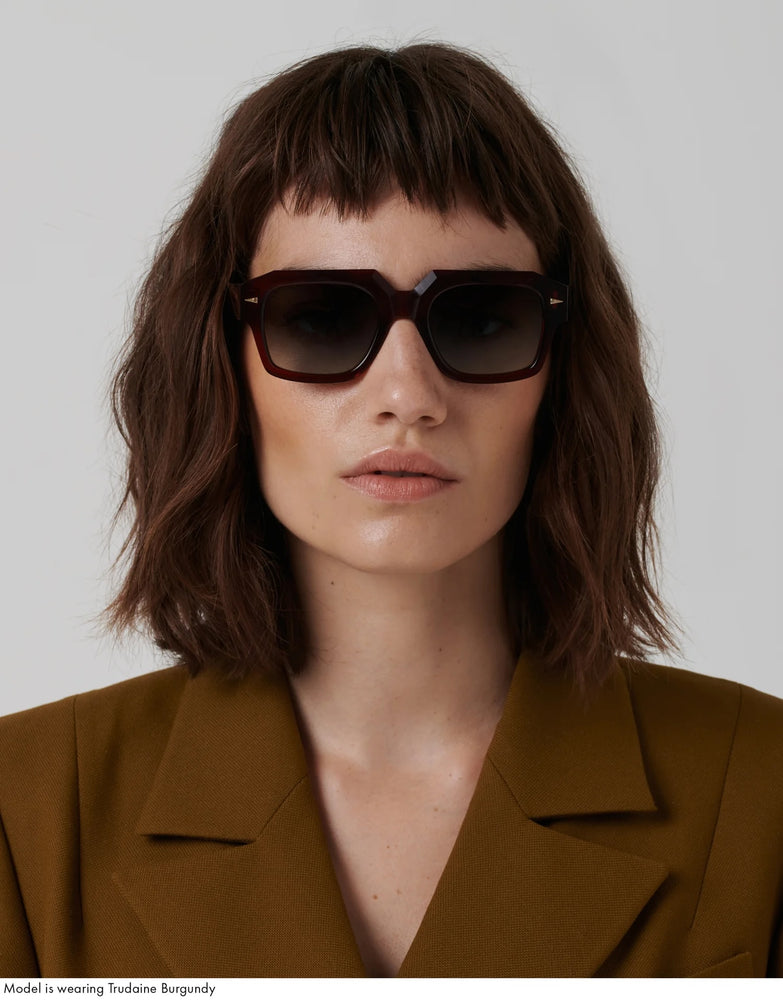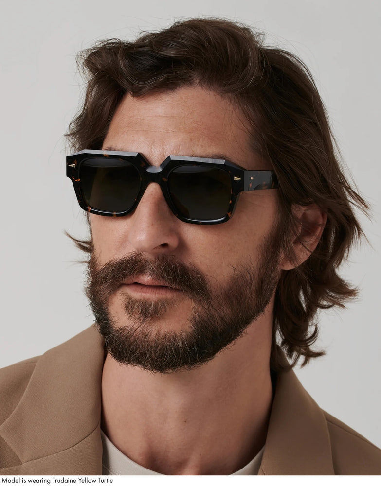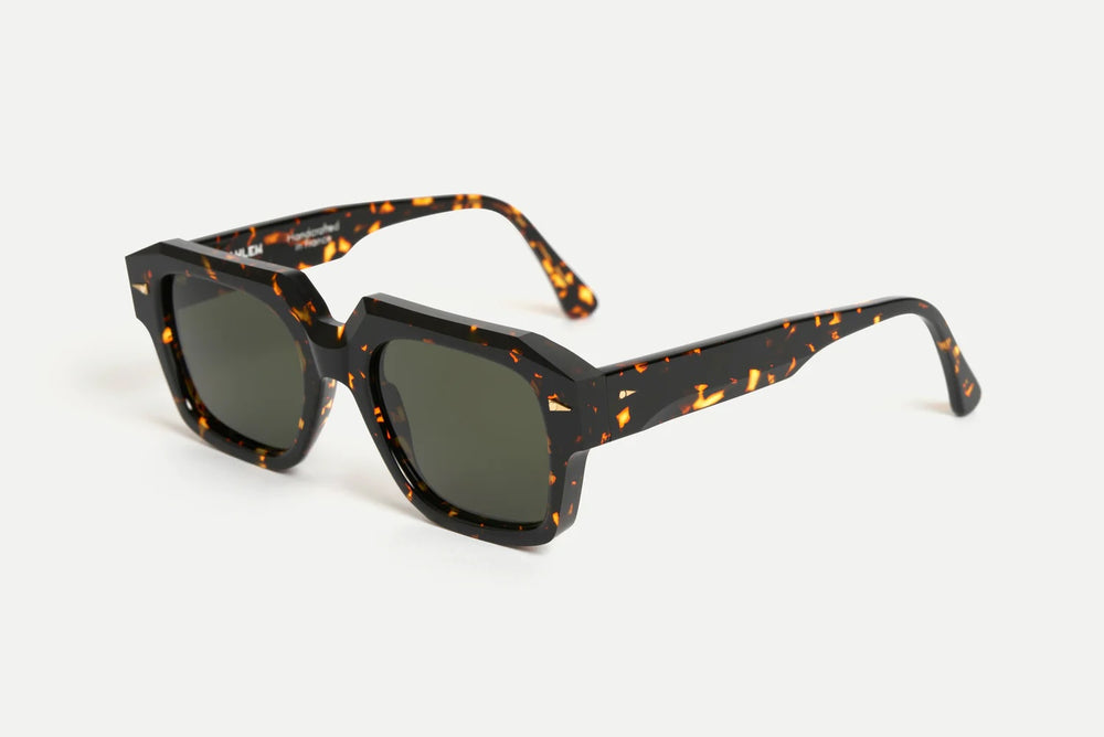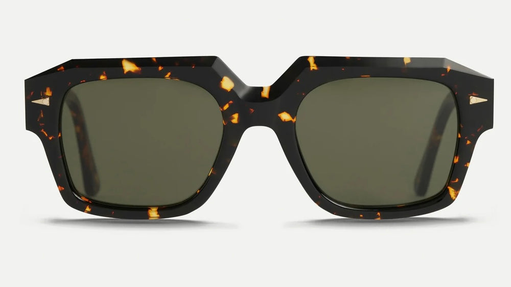 Bold, oversized square sunglasses featuring a chunky tortoiseshell acetate frame with subtle golden flecks throughout. The dark green lenses are set within a substantial frame that makes a strong architectural statement. Small metallic arrow details accent the frame corners, adding a refined touch to these luxury sunglasses. The substantial build and classic tortoise pattern suggests high-end craftsmanship typical of French eyewear design.
