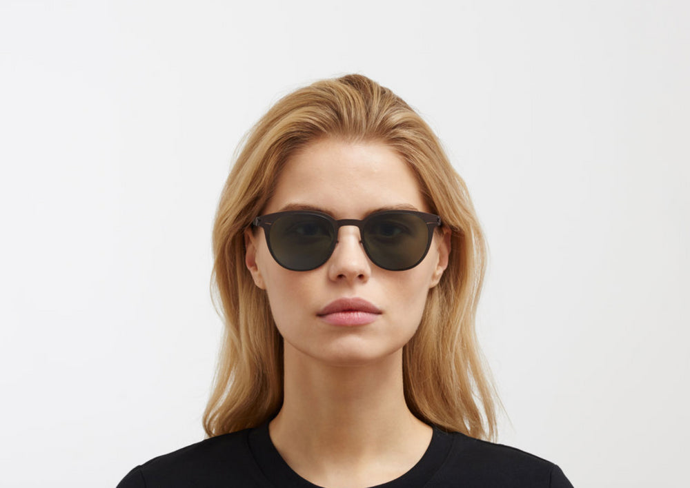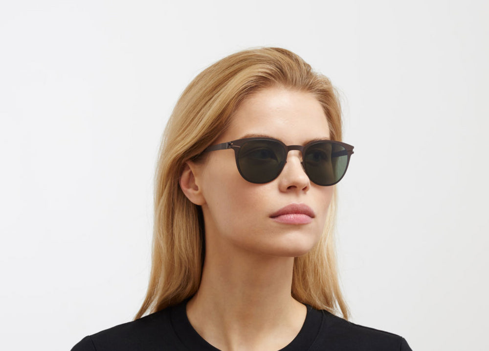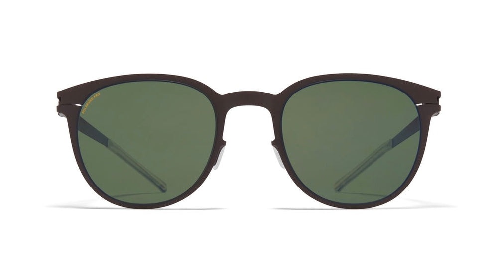 A sophisticated and minimalist round-framed sunglasses design by MYKITA. The frames feature a sleek, matte brown metal construction with a modern, understated aesthetic. The green-tinted lenses are perfectly circular and complemented by the thin, elegant frame profile. The design includes subtle nose pads and clean lines throughout, making it a versatile piece that combines contemporary style with classic elements. The overall construction appears lightweight and refined, ideal for everyday wear while maintaining a premium appearance.
