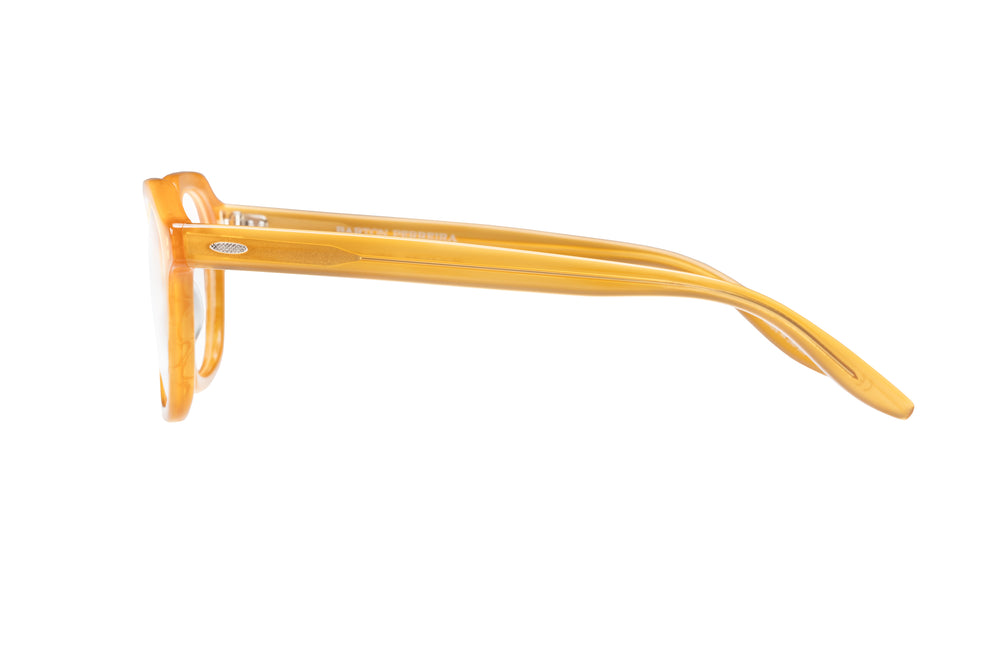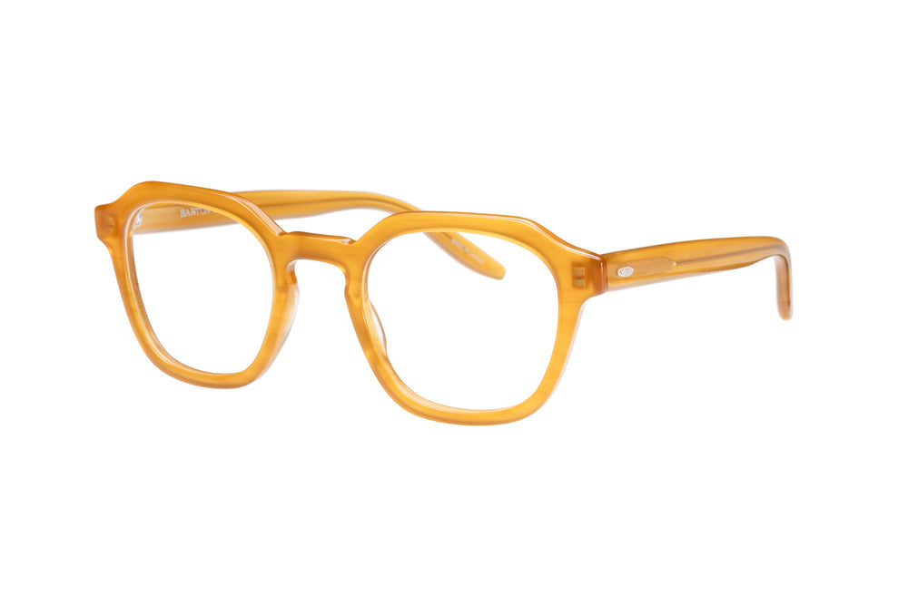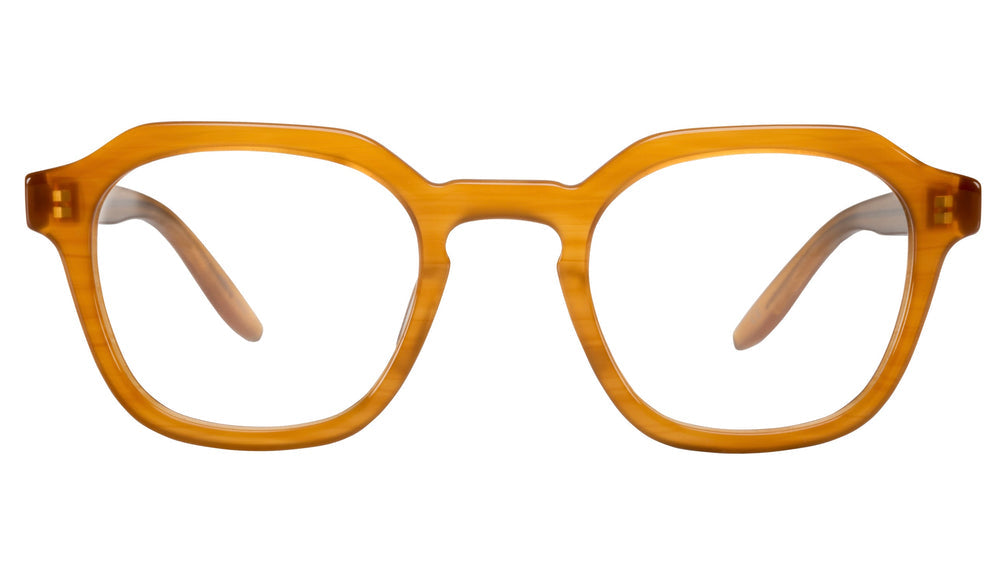 These are sophisticated geometric-shaped glasses with a thick honey-amber colored acetate frame. The design features a bold, architectural silhouette with straight lines and angular corners. The frame has a translucent quality that gives it depth and dimension. The saddle bridge creates a comfortable fit, while the substantial temple arms complement the overall robust design. The glasses have a vintage-inspired aesthetic with a modern twist, suitable for both professional and casual settings.