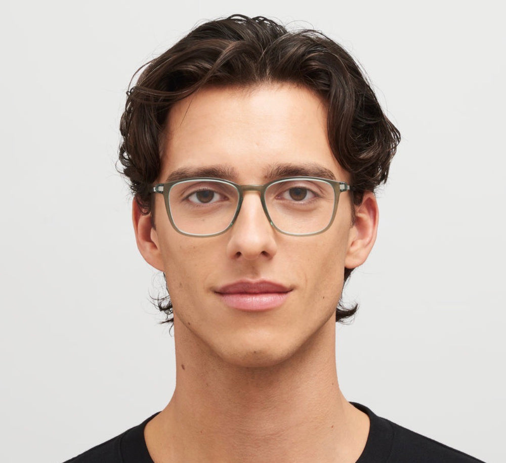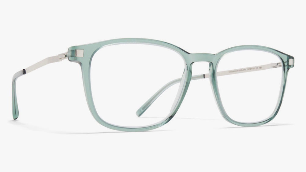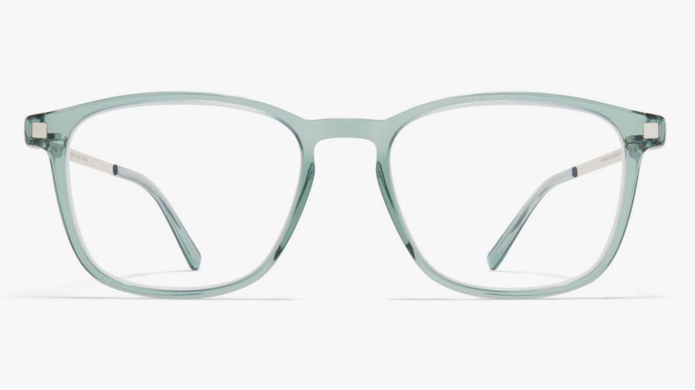 Sleek and modern rectangular frames in a subtle mint/sage green translucent plastic with slim silver metal temple arms. The design features a minimalist single bridge construction and clean lines throughout, creating a sophisticated yet contemporary look. The transparent acetate material gives these frames a light, airy quality while maintaining structural integrity.