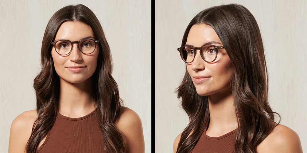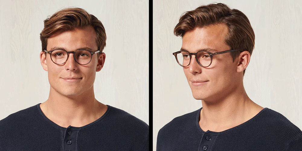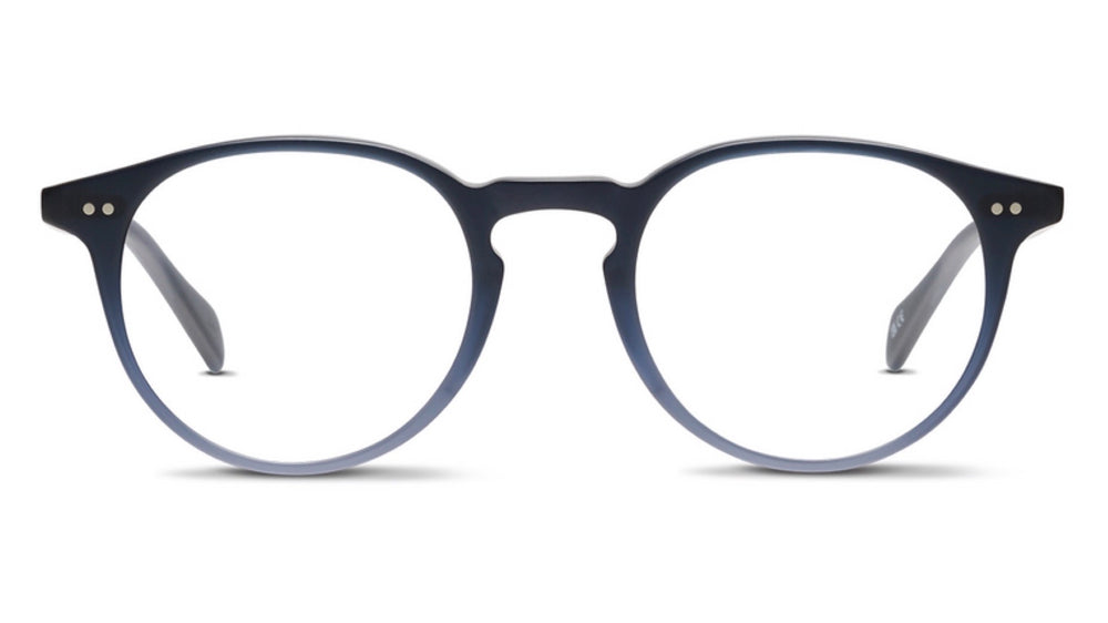 A sophisticated round-framed pair of glasses featuring a gradient blue-to-clear colorway that darkens at the top and lightens towards the bottom. The frame has a classic pantos shape with subtle rivets on the front corners. The overall design is minimalist and modern, perfect for both casual and professional settings. The frame has a smooth matte finish and appears to be made of high-quality acetate with excellent craftsmanship in the gradient coloring technique.